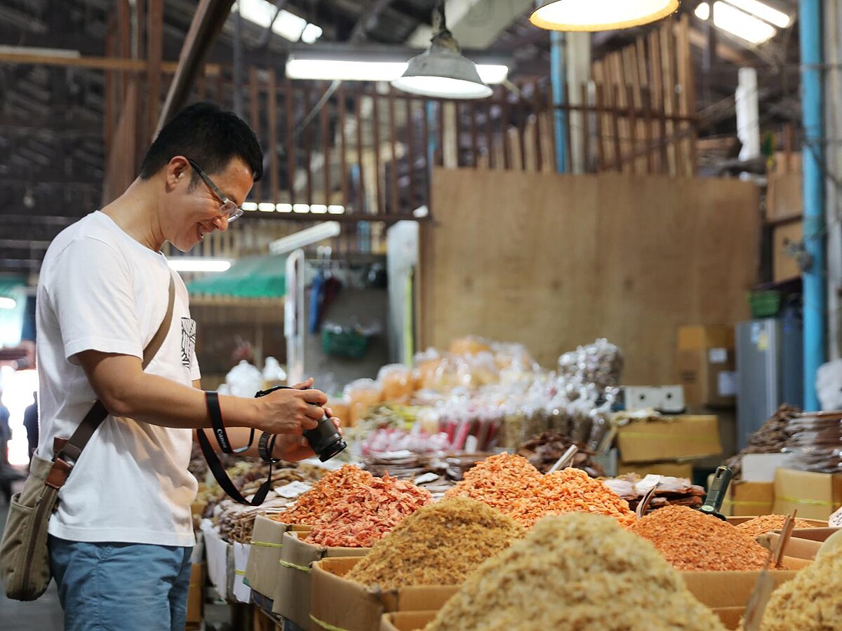當然,老城區的魅力也從來不是只侷限於歷史的文化景區,真正迷人的,還是來自生活中那些平常卻又不平常的在地風情。我們入住飯店的隔天,決定來個曼谷老城區的早晨時光,於是沒有計劃,也沒有方向,隨便一個轉身巷內,竟然沒入了在地的傳統乾貨市場,那微鹹帶海味的氣息,還有一籠籠的粉紅帶褐色,讓人想起了小時候的市場回憶;而走過一間間的老店舖,很難不被架上的復刻時光吸引,於是停下了腳步,心想,就繞一圈看看就好。結果,走出店家,手上硬是帶了2罐標榜「頭痛醒腦」的滾珠清涼油。這對味的泰國藥草清香舒服,而且只要50泰銖,划算!