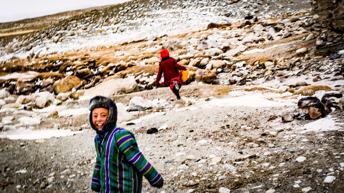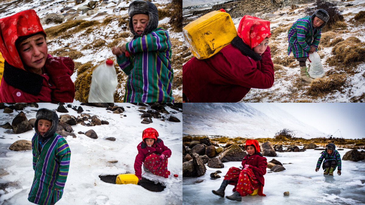 在這個時候,Sakina才真正綻放出了孩子應該有的笑容。『拍吧!盡量拍!家裡的大人都不在這裡,我可以盡情得當個小孩。』Sakina笑著看著鏡頭,彷彿像是這樣說著。Sakina不時回頭望著屋子,可能是在觀察大人是不是準備出來罵人,但或許難得的自由,Sakina也豁出去了吧。當姊弟們把水桶背回去屋子的時候,姐弟倆的背影在崎嶇不平的山路上與狂風中緊緊依偎著。在未來他們長大的那一天,聰明懂事的弟弟,會像現在一樣全力保護著這樣照顧他的姊姊嗎?或著是,如果有一天,弟弟變得像其他霸道、不講道理的男人的時候,姊姊是不是依然會像今天一樣,愛他依舊?他們是不是還會記著在小時候在河川上滑著冰,這麼單純、沒有利益的時光?