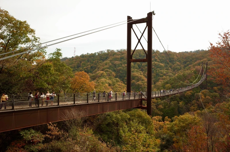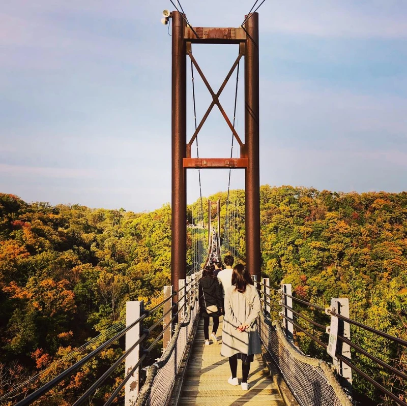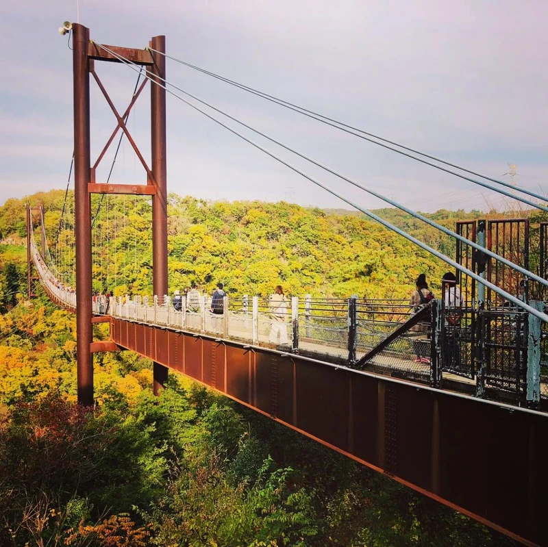 雖然高度很高,但意外不太搖晃,寬度也可以兩人擦肩而過,還可以在橋上盡情停留拍照。一年當中就屬秋天的賞楓紅葉季節有最多遊客到訪。