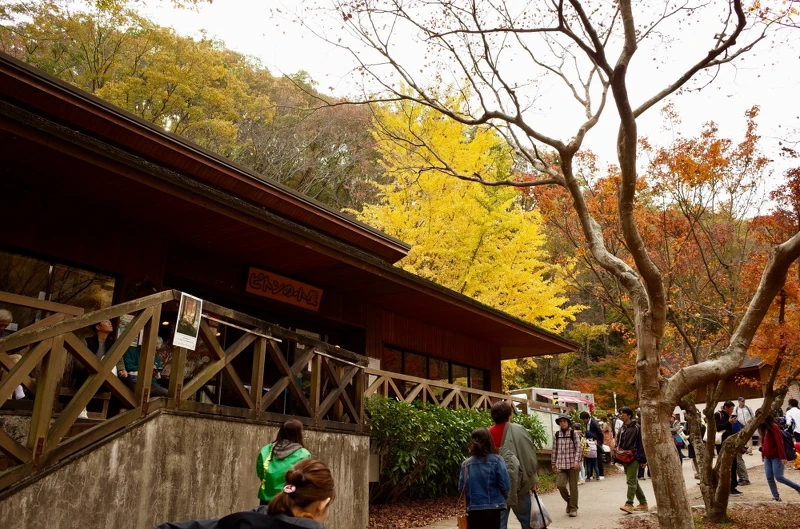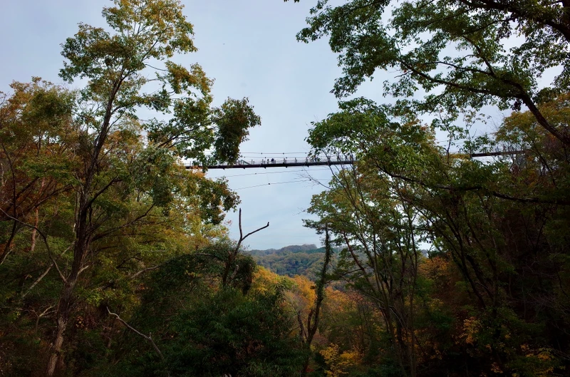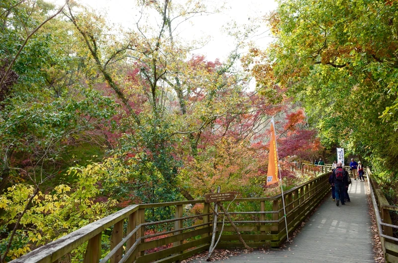 走完吊橋後先不要急著回去,繼續沿著指標走15分鐘就可以來到展望台,從這裡可以俯瞰被山林圍繞的吊橋,遠處盡是染上紅色及黃色的秋葉,彷彿一幅水彩畫般色彩豐富,令人忍不住停留多看幾眼。如果天氣好的話還能看到大阪和京都街景喔!別忘了在這裡補充水分和食物, 因為大飽眼福後就準備下山,還得繼續走回車站。