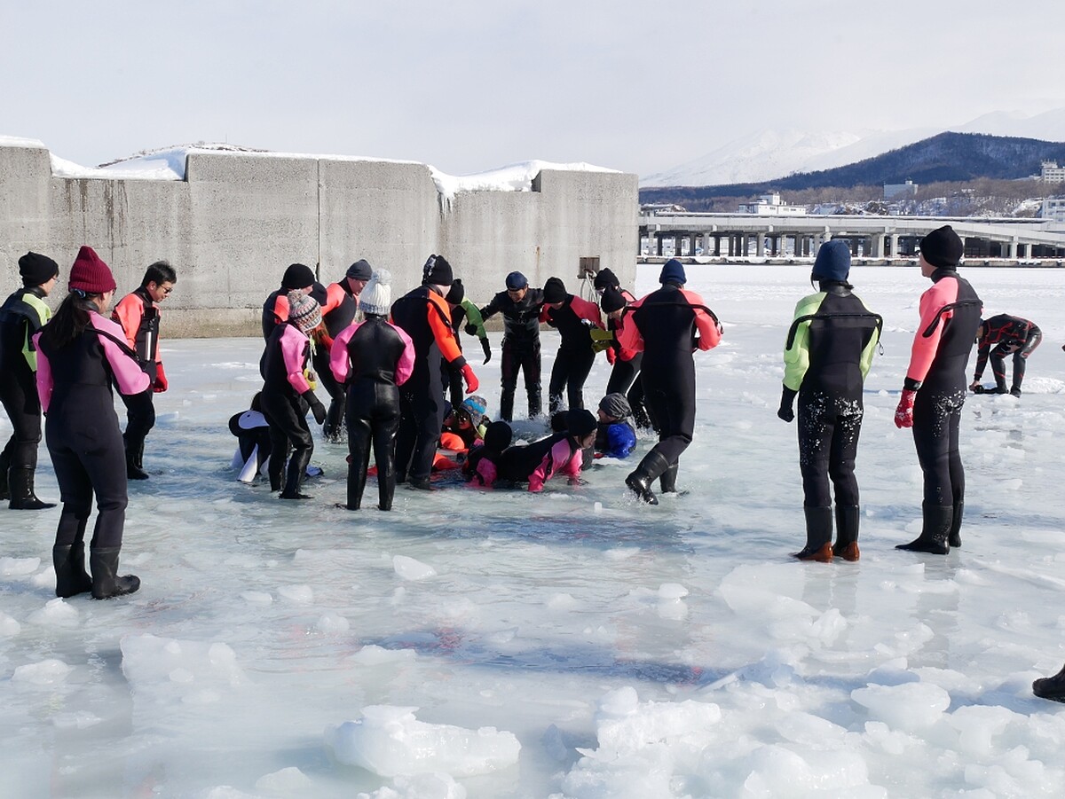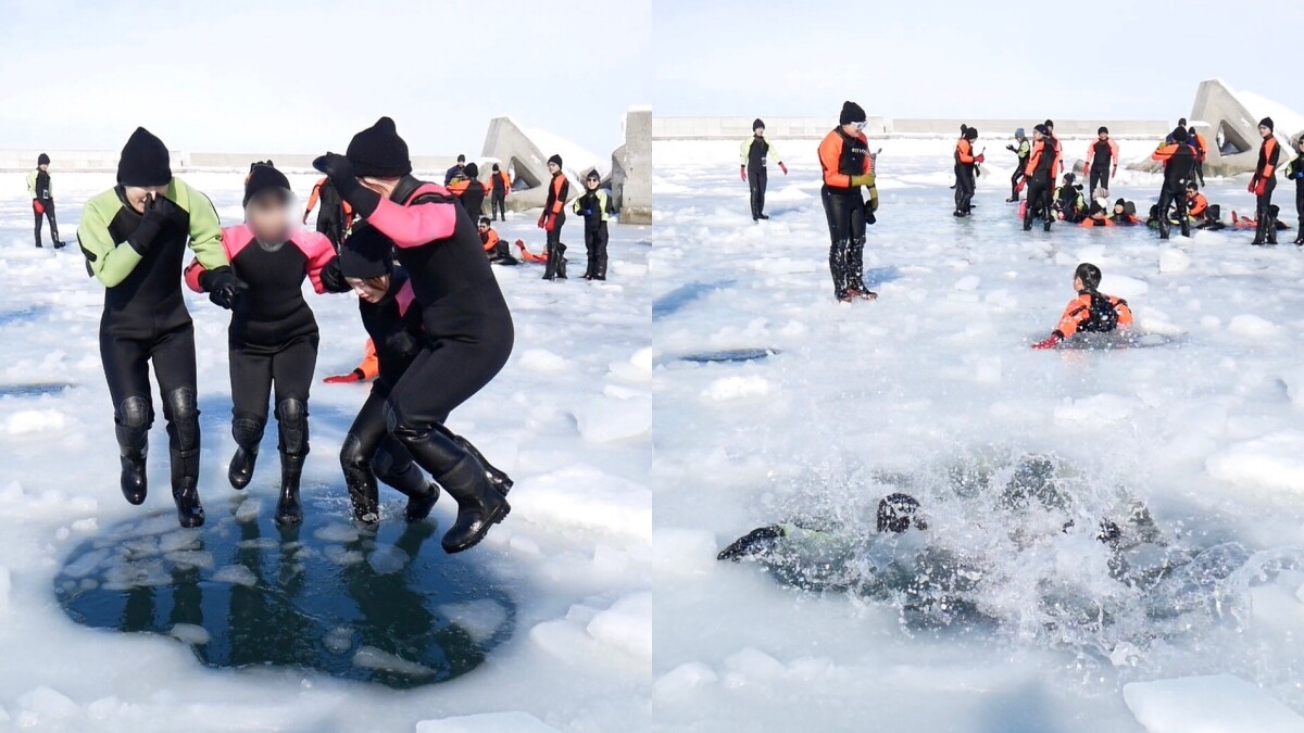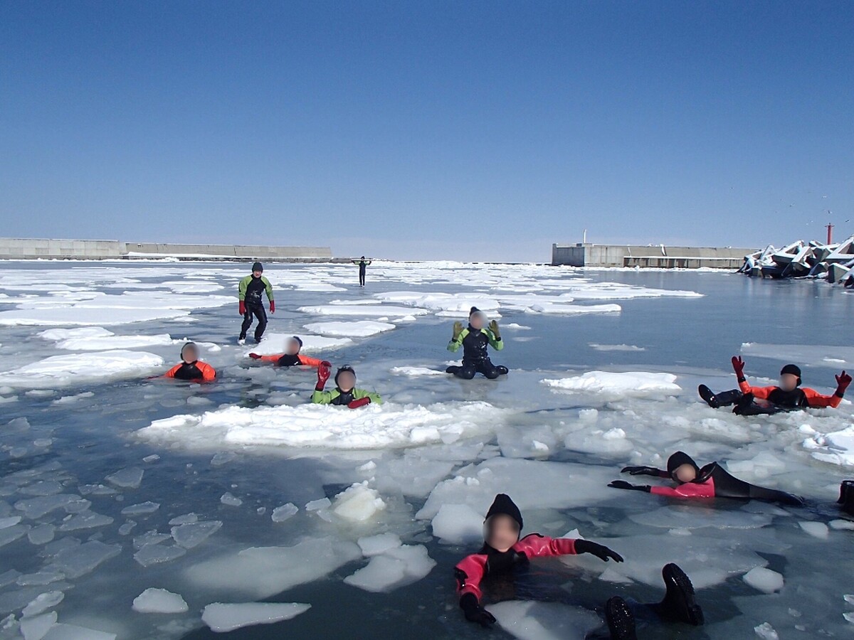 終於流冰破碎的瞬間大家就一起入海了!初體驗的MiKU真的很擔心會沉下去,不過還好我們身上穿的乾式防寒衣會產生浮力,所以不需要做任何動作身體也自然會浮上來喔。