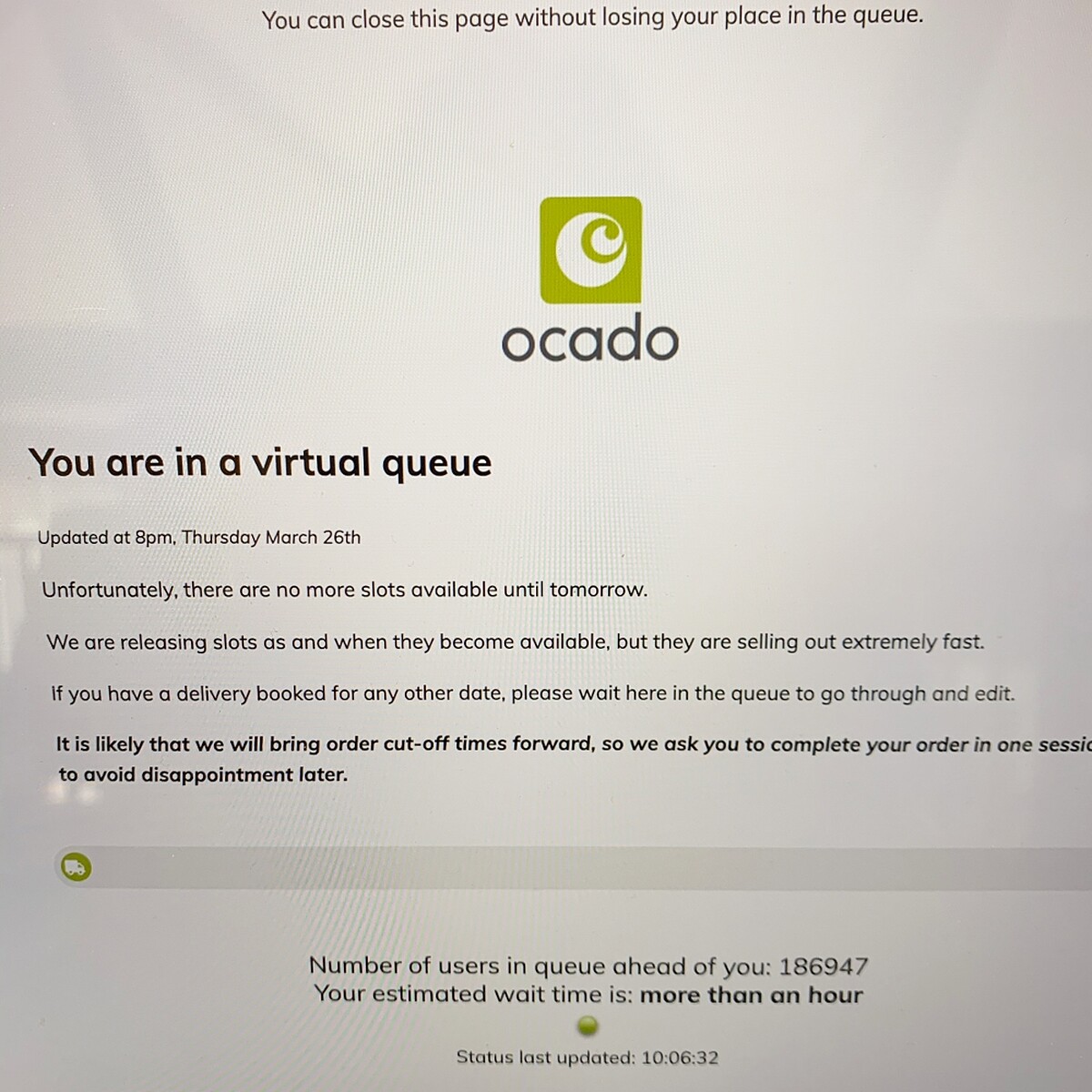 過去不曾需要提前預訂的超市宅配服務,竟然出現登入進系統後所有的time slot(配貨時段)全滿,訂不到的狀況,到最後知名線上超市Ocado更出現了暫時關閉app服務,全民必須網上虛擬排隊等候進入頁面的奇異景象。還記得當時各家超市紛紛在網上公告貼出公告,希望大家能夠保持冷靜,不要囤貨,資源絕對是充足的,請理性消費。