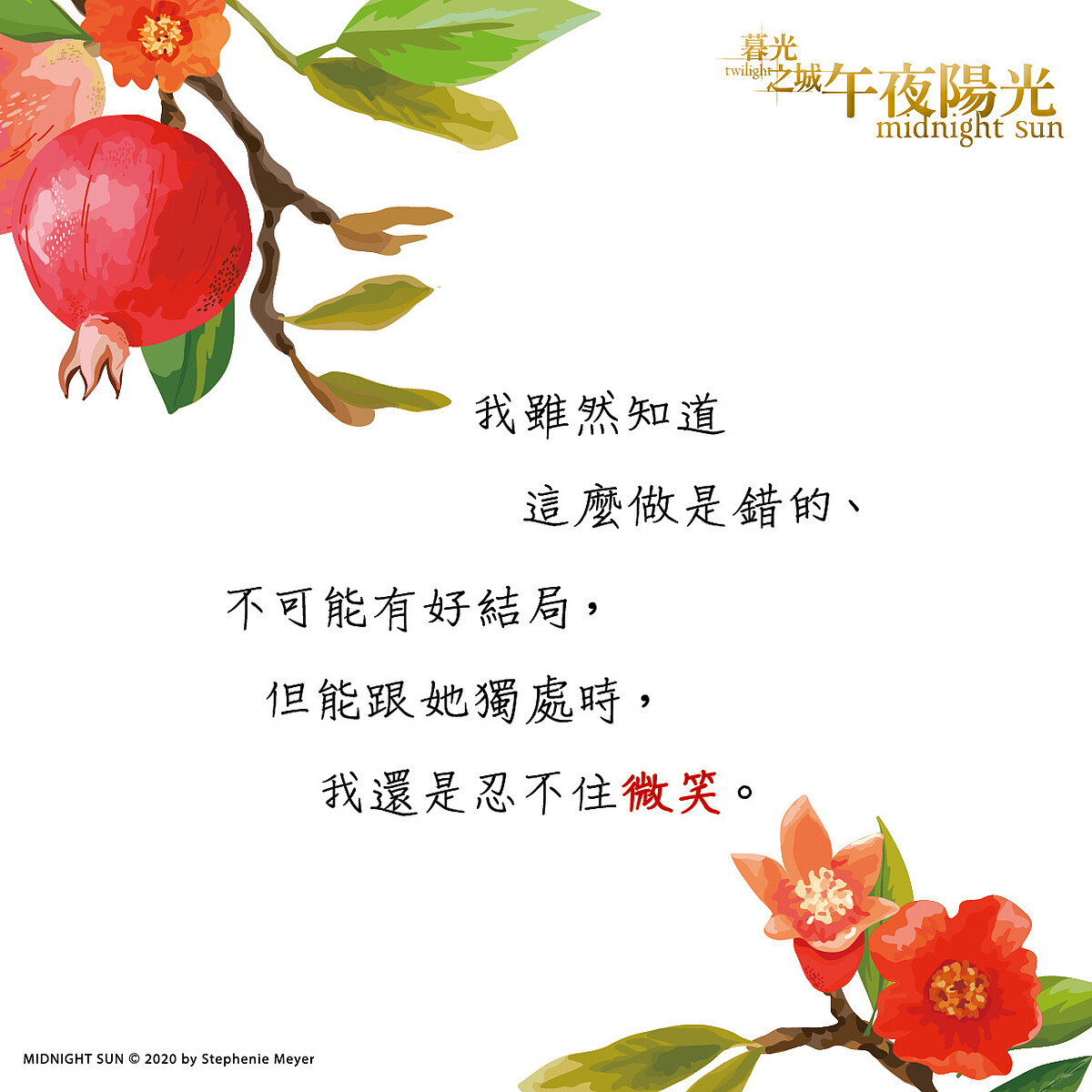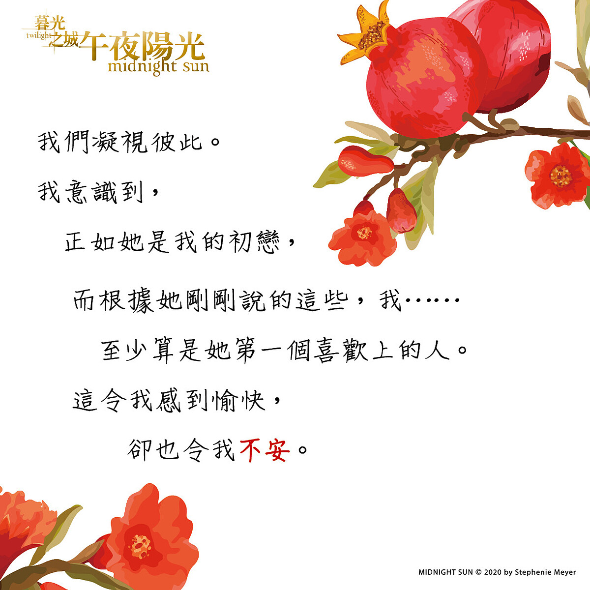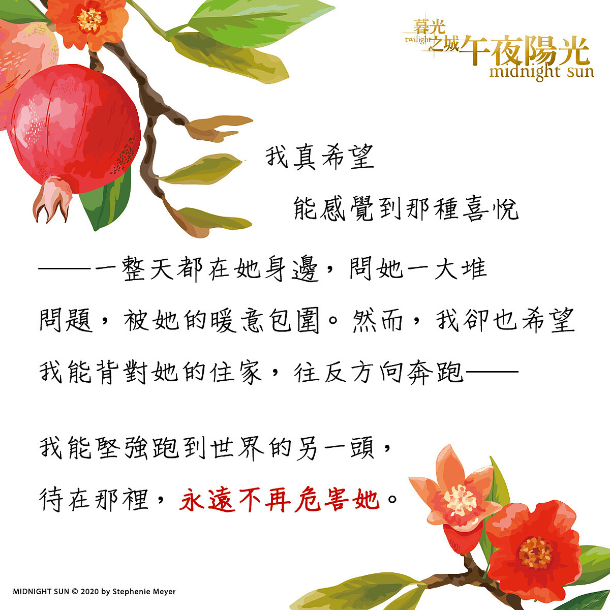 神奇的是,這樣的感覺,竟然在時間流逝之下,與這本《暮光之城:午夜陽光》有了神奇的連結。在這本以愛德華角度來重新描寫《暮光之城》故事的作品裡,由於我們已有所成長,因此對於愛情在現實中可能會遇到的問題有了更多了解,進而使書中那些愛德華面對愛情,比貝拉帶有更多猶豫及掙扎的考量,就這麼與心境較為成熟的我們,形成了一種嶄新的共鳴。