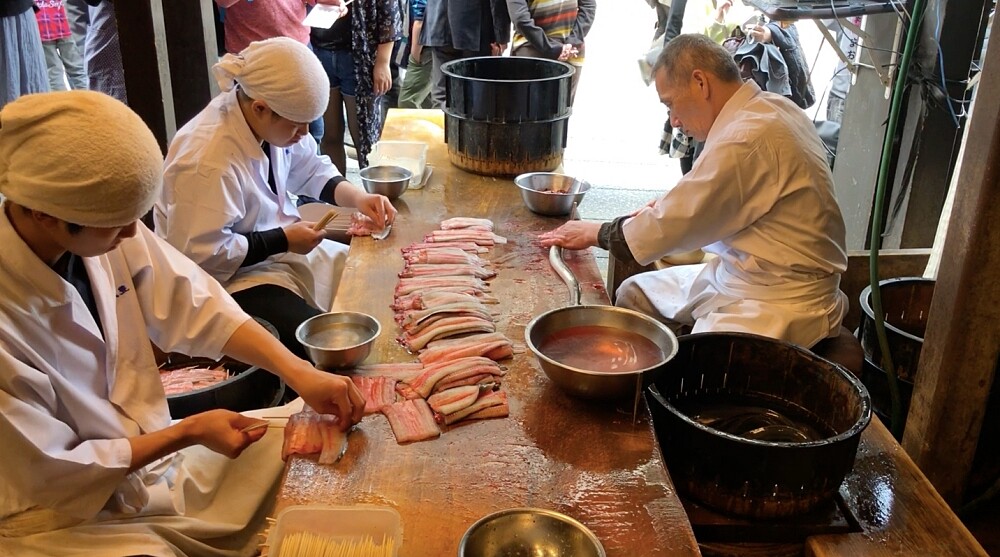 最特別的就是川豐將活生生的鰻魚到化成香噴噴鰻魚飯的過程全部公開給你看~看師傅手法流暢的從木桶中撈出生鰻,將魚頭釘在砧板上固定後俐落的從背部一刀劃開,沒幾秒就處理成三片鰻魚。雖然畫面血腥令人於心不忍,所以在食用時心存感激、仔細品嚐囉!