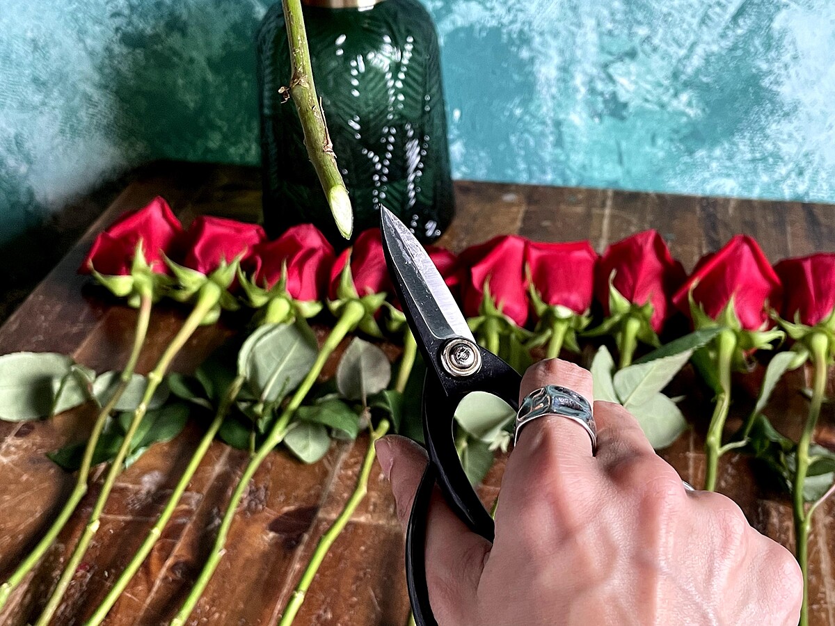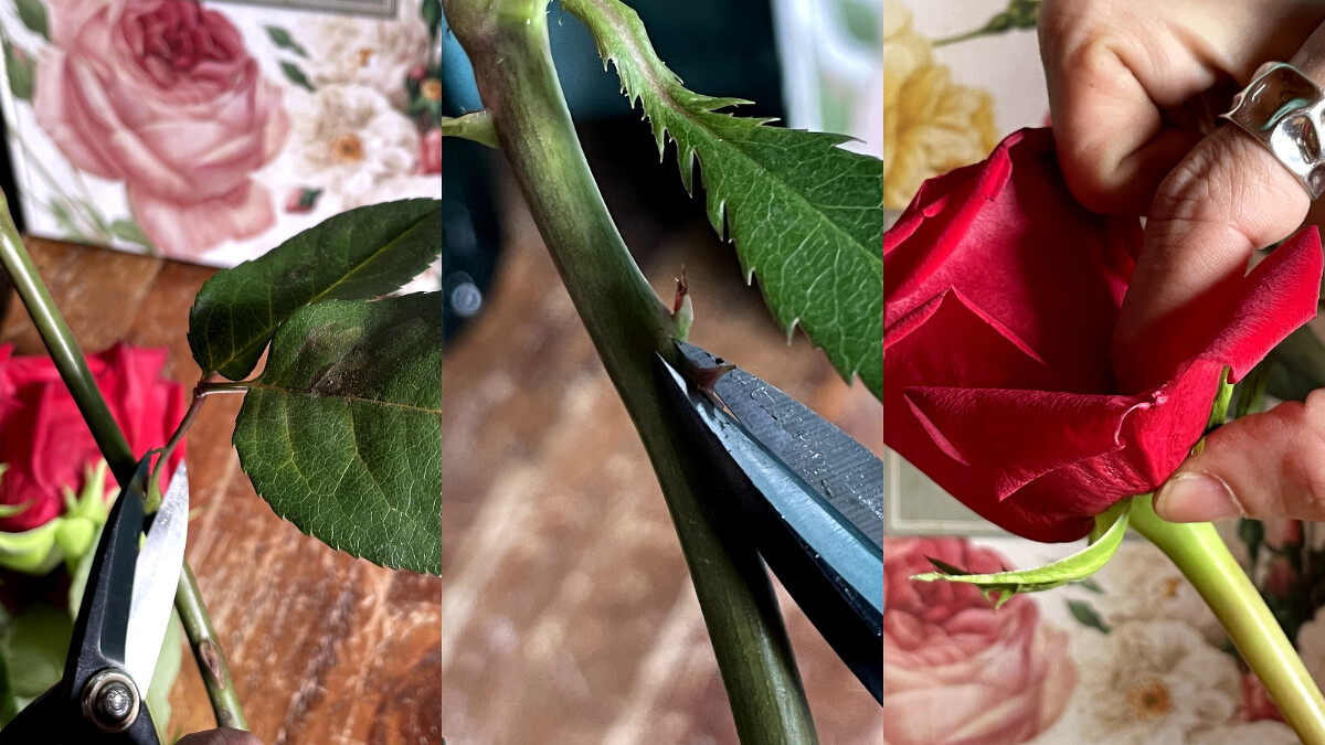 除了預防自己嬌貴細嫩的手被花梗上的小刺(如玫瑰)扎傷之外,葉子也會分散花朵的水分,進而影響玫瑰花朵綻放的時間,所以最好使用專用花剪,將過多的葉子及花梗上的刺剪除 ; 將玫瑰外層看起來舊舊皺皺的保護瓣及受損的花瓣拆除,這些有保護瓣的玫瑰還在花店時,能保護玫瑰在運送過程中受損,因此買回家後再自行整理會更好。