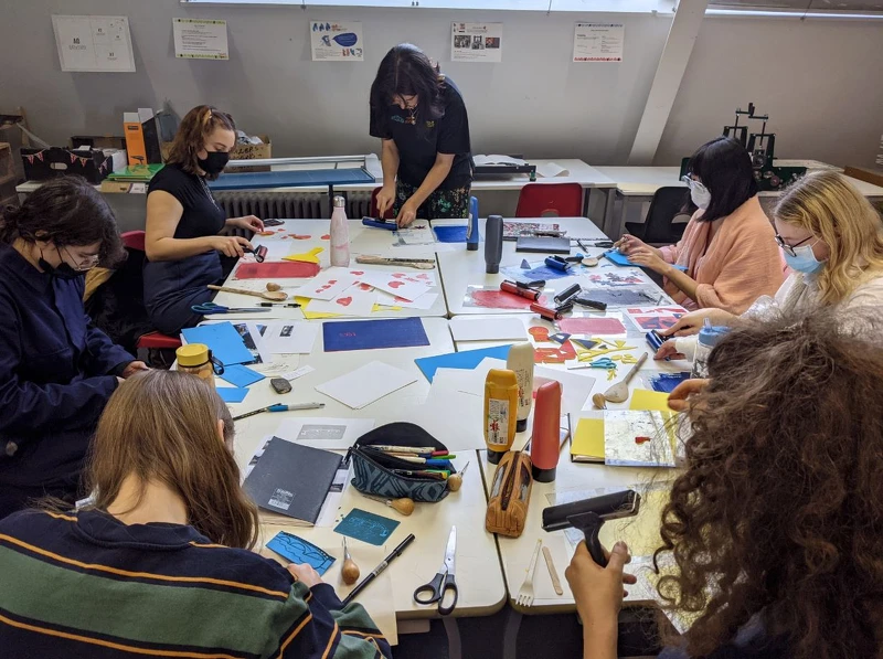 當初積極爭取這份工作,是對高等教育的參與有熱誠有想法,我覺得教課、跟著學生一起學習,是一件無比幸福的事。能夠設計課程、獨立教課是助教一職最吸引我的部分,星期三是我實現這個願望、累積教學經驗的日子。工作坊的內容設計,還是有整合專題課程與主軸方向要求的。第一:最好能配合學生正在進行的專題作業;第二:以版畫、裝幀藝術為主。