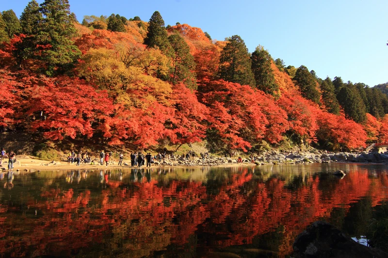 香嵐溪是位於愛知縣豐田市足助町的溪谷,也是愛知高原國定公園裡的一部分。背有飯盛山佇立,名字中的「香」取自飯盛山山腰上的「香積寺」;「嵐」則指溪谷中的靄靄「嵐氣」。據說最早是由香積寺第11代住持-三榮禪師在1634年,為祈願當地自然環境更加優美,一邊唱誦般若心經,一邊在巴川沿岸參道到香積寺境內種植楓樹及杉木。後來當地的青年會、婦女會等團體為了將此地打造成森林公園,更是大量植樹,促成了今日滿山楓紅的美景。