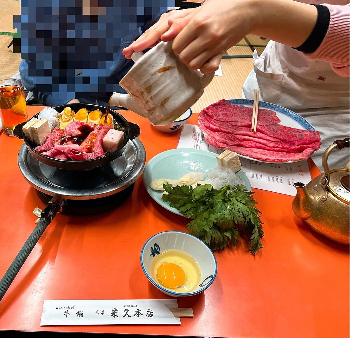平價又能填飽肚子的壽喜燒才是當地人的最愛。位於淺草商店街內充滿濃厚昭和氣息的兩層樓建築物,每到假日總是人氣爆棚,米久也是創立於1886年的百年壽喜燒老舖。在這裡只要花千元台幣就能吃到上等牛肉套餐。雖然平價但肉質可不馬虎,只選用嚴選和牛。小小的鐵鍋由店員協助燒肉,然後可以隨自己喜好加入醬汁或水調整濃度,香醇醬汁和柔嫩牛肉就是超下飯!想要體驗壽喜燒風情的話,米久就是個好吃又不貴的選擇喔~