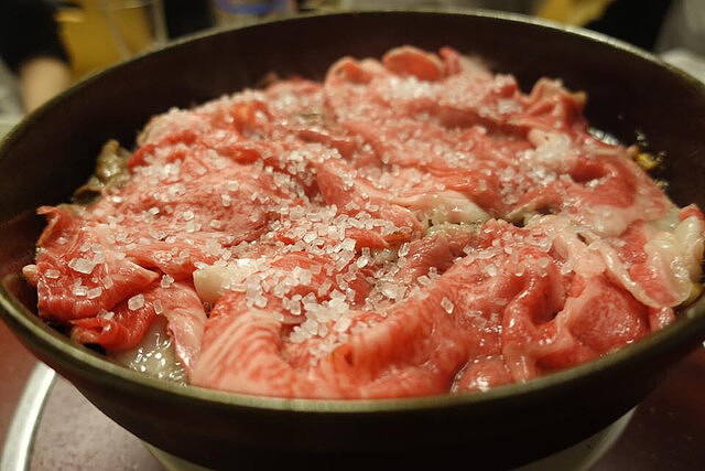 純關西風的せきぐち,低調的店面外觀其實可是創業於1884年,超過140年的壽喜燒老舖呢! 一開始就先在高溫的鐵鍋中放粗砂糖和牛油,等油脂溶化後煎肉和蔬菜,並在蔬菜出水後才用醬油調味。
