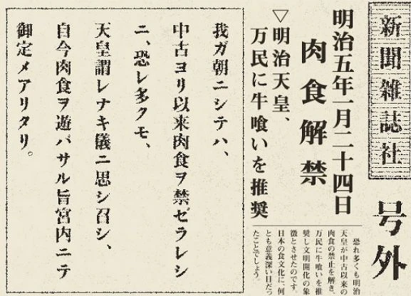 日本曾有過長達1200多年的禁肉時期。時間要追溯到天武天皇於西元675年下達了在耕作期對五畜(牛、馬、狗、猴、雞)的禁食令,尤其牛是耕作的重要朋友,吃牛肉更被視為一大禁忌。後來隨著佛教思想的盛行,逐漸地演變為吃肉是汙穢暴虐的舉止,於是肉類從餐桌上消失了。直到明治維新時,日本政府全面吸收西方國家的文化,包括飲食習慣,並以為西方人的人高馬大是與愛吃肉有關,因此大力推動食肉風潮。而當時的明治天皇於1872年1月24日在宮中親嚐牛肉,並在同年頒布解除了長達1200年的禁肉令,於是1月24日便成了牛肉紀念日。