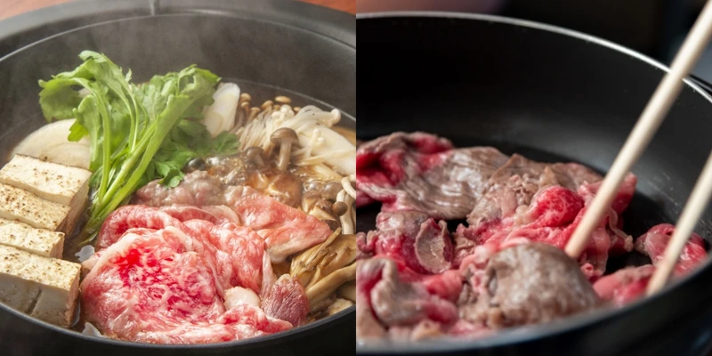 關東和關西文化大不同,在飲食上也存在不少差異。光是壽喜燒的調理方式就各分東西。關東是將調料事先混合成醬汁, 然後將醬汁先倒入鐵鍋中, 再加入肉、豆腐、青菜等食材用「煮」的;關西則是在鐵鍋中先「煎」肉,再直接加入砂糖和醬油調味,最後放進蔬菜等食材後加水調濃度。無論關東或關西,最後一定要蘸著生雞蛋吃才能中和濃郁醬料的甜膩、突顯食材的鮮嫩順口喔~