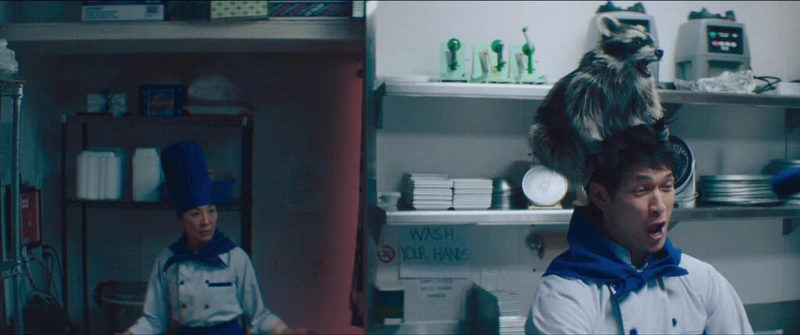 至於王家衛的《一代宗師》與《花樣年華》,也同樣能讓人在片中找出得以對應的段落,就連畫面呈現上,也有如同曾於《重慶森林》與《墮落天使》中出現過的拍法(也就是《凌凌漆大戰金鎗客》中,周星馳斜倚在豬肉攤旁,準備啜飲手上那杯Dry Mratini時的擬仿畫面),甚至就連惡搞到不行的「熱狗手宇宙」,也有人懷疑其源頭乃是出自《與龍共舞》,足見《媽的多重宇宙》那種幾乎可說是處處有彩蛋,每個地方都讓人試圖尋找出處的獨特樂趣。