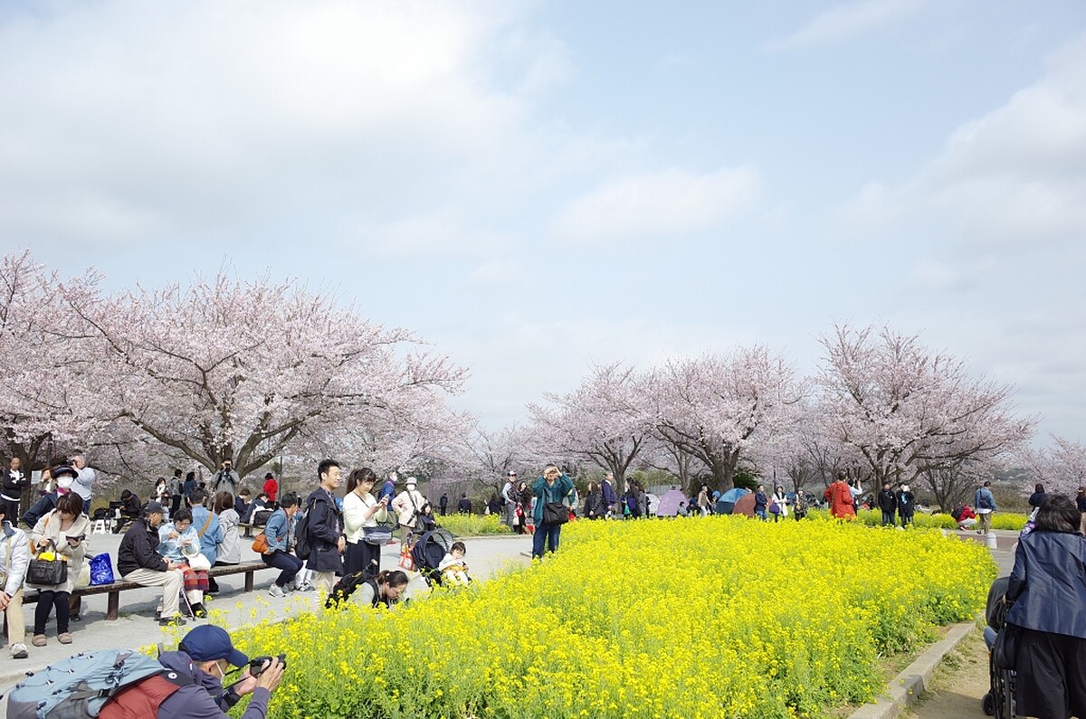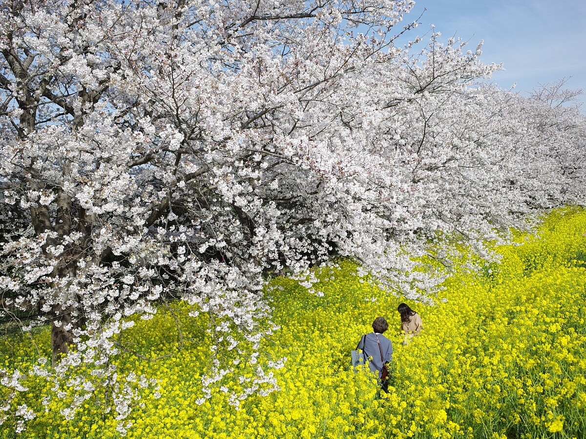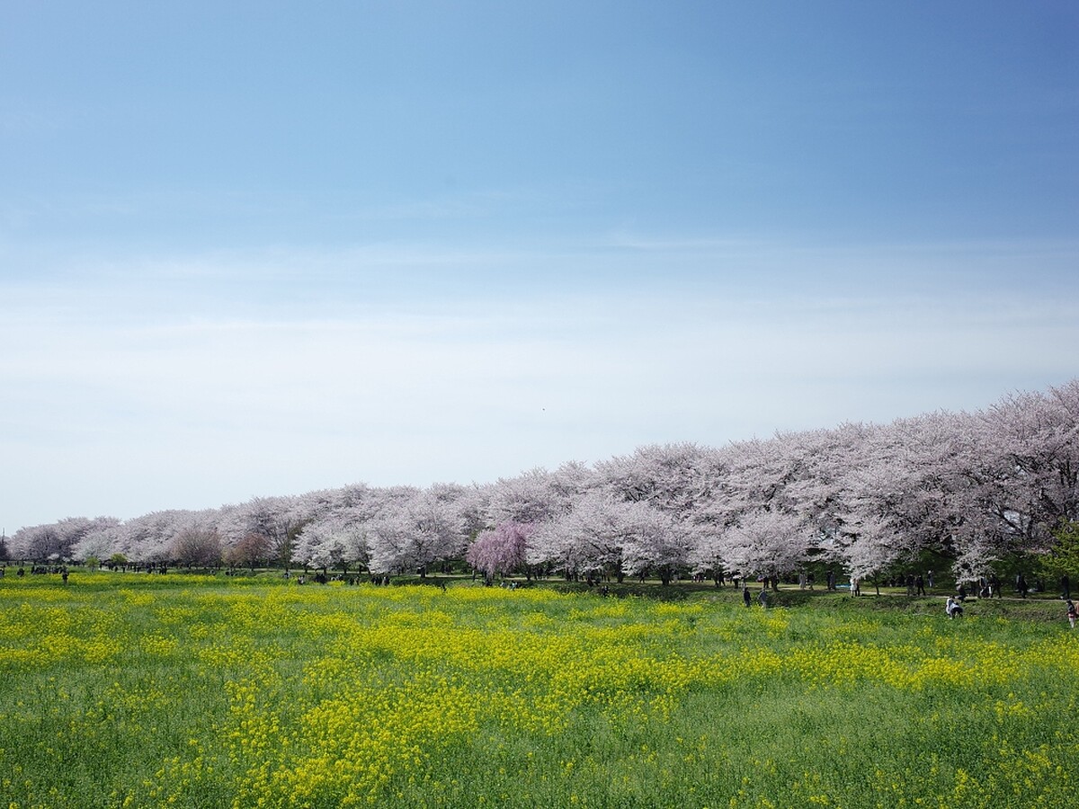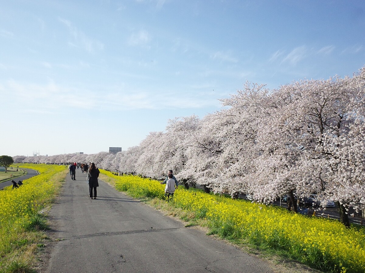500棵染井吉野櫻的櫻花樹沿著荒川河堤約2公里綻放,加上旁邊的油菜花海相互輝映,交織出春日美景。不少人走進油菜花海中拍照、野餐、看書甚至只是來睡個午覺,享受在大自然中的愜意。