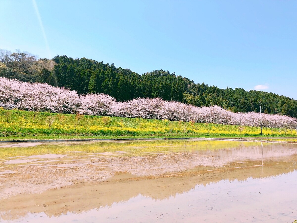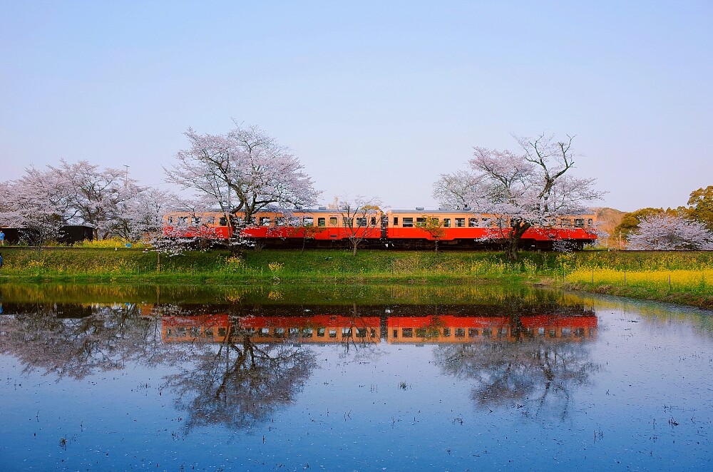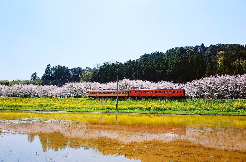 小湊鐵道櫻花季必訪的景點!無人車站的飯給站前有一片水田,當櫻花盛開時,水田就成了鏡面,櫻花倒映在水面的景色令人嘆為觀止。被吹風吹拂後櫻花花瓣飄落在水面上也是美輪美奐。