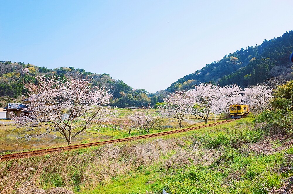 上總中野站是小湊鐵道和夷隅鐵道的轉乘站,在等車時不妨走出車站,來到站前廣場就能拍到櫻花、油菜花及鐵路線同框囉~但地方火車的班次較少,要注意換車時間不要錯過火車啦!
