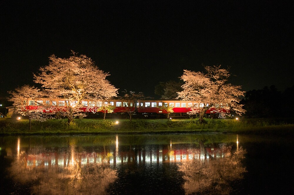 夜晚被打上燈光的櫻花樹與水面倒影更增添浪漫風情。