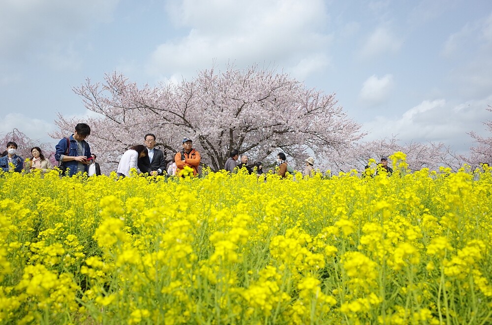 而一旁的廣大油菜花田更是一大看點!金黃色絨毯與櫻花相伴的美景引人入勝。