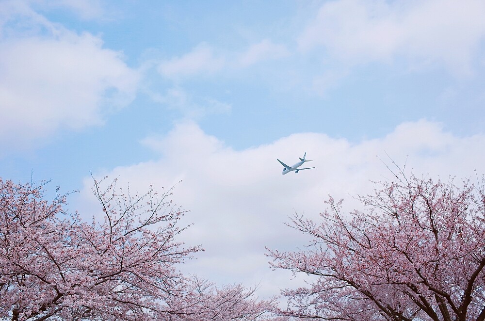 成田櫻山公園是位於成田機場4000米跑道北端小山丘上的公園,園內有約500棵櫻花樹,是機場建設當時將機場內的櫻花樹移植於此。在這裡可以近距離觀賞飛機的起降,這天因為是吹南風,所以從北向南降落的飛機從眼前呼嘯而過,震耳的引擎聲更是增加臨場感,畫面十分震撼!