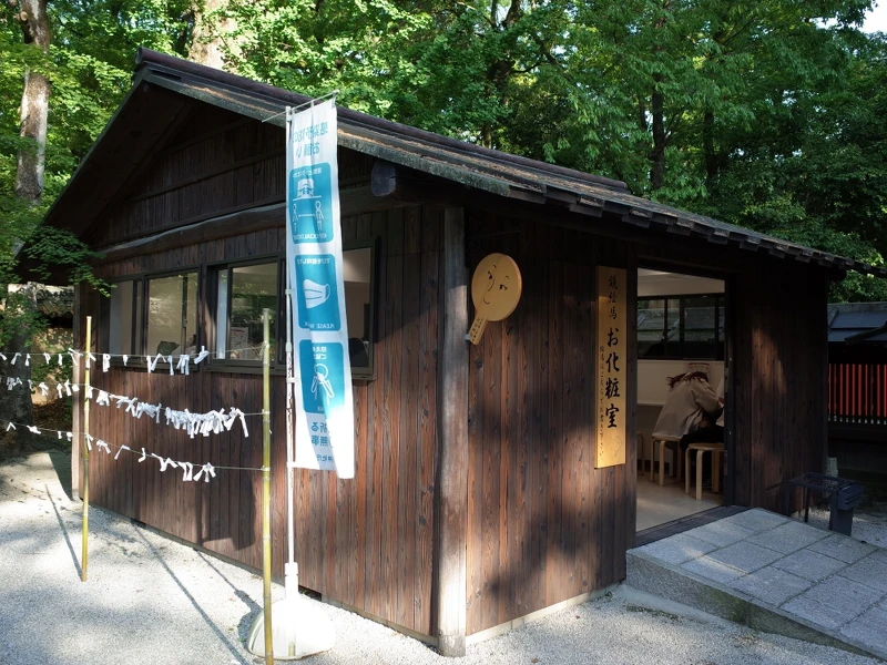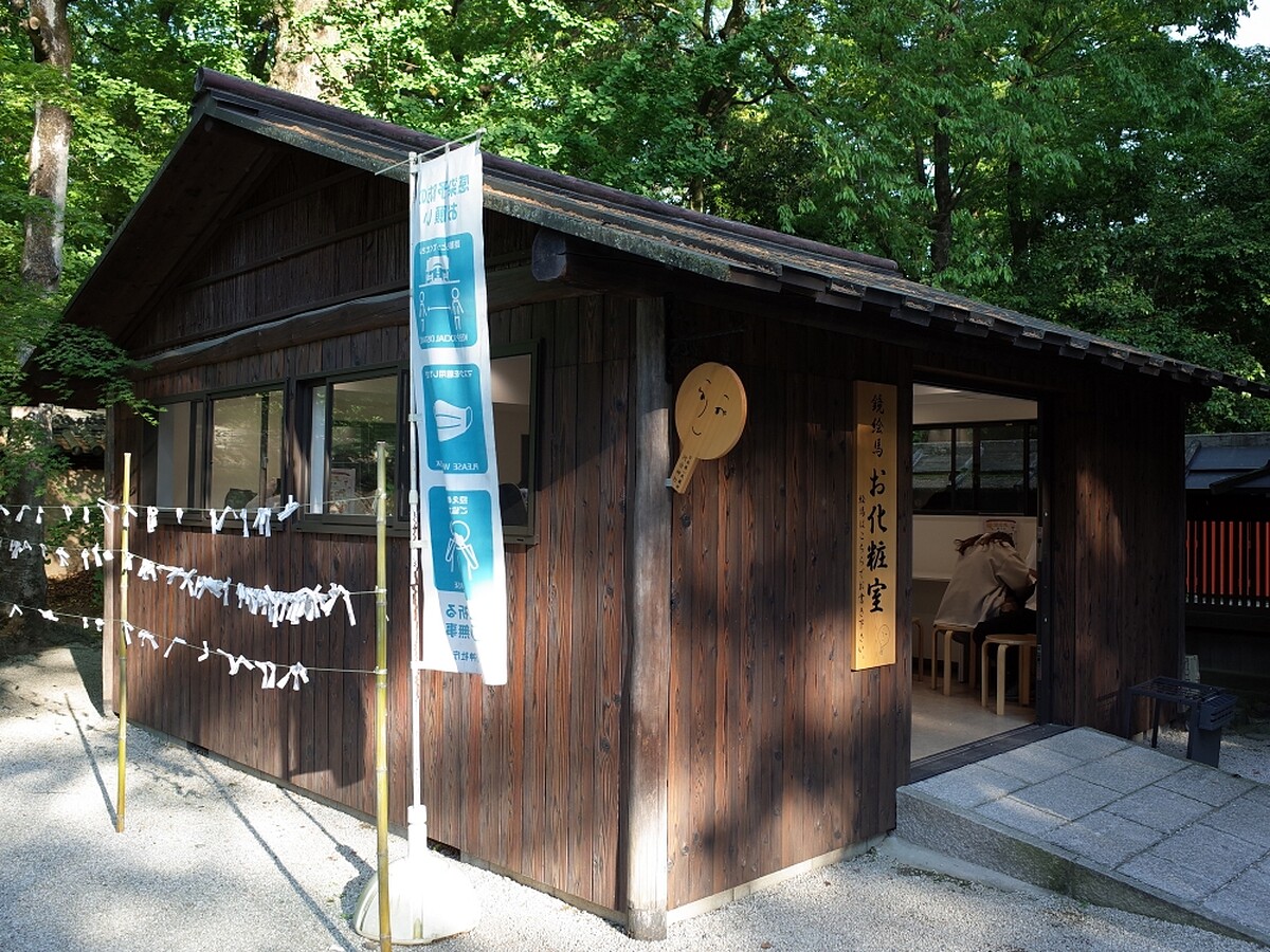 境內還設置專屬「化妝室」,讓你可以在裡面慢慢為鏡繪馬上妝。忘了帶化妝品也可以跟社務所借色鉛筆畫。畫完後再點一杯用御神水加上蜂蜜花梨沖泡的「美人水」,讓你美貌UP!