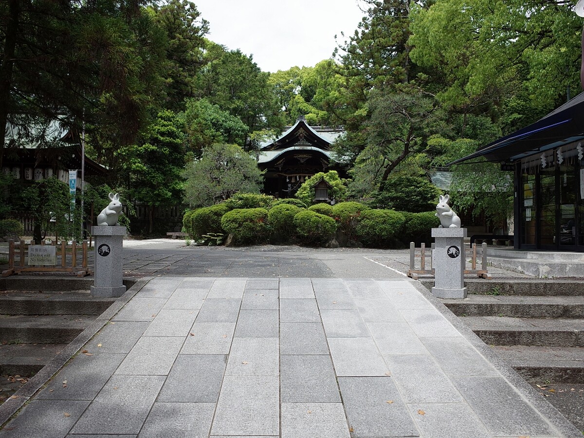 進入岡崎神社首先看到在本殿兩旁擺的不是常見的神獸狛犬,而是嘴巴一張一合的一對石兔子~因為這裡就是有名的兔子神社。曾經在神社一帶是野生兔子的棲息地,而多產的兔子也被認為是神的使者,此外,神社的主祭神是素戔嗚尊、櫛稲田媛命和他們的子女三女五男八柱御子神,所以被認為是庇佑求子及安產相當靈驗的神社。