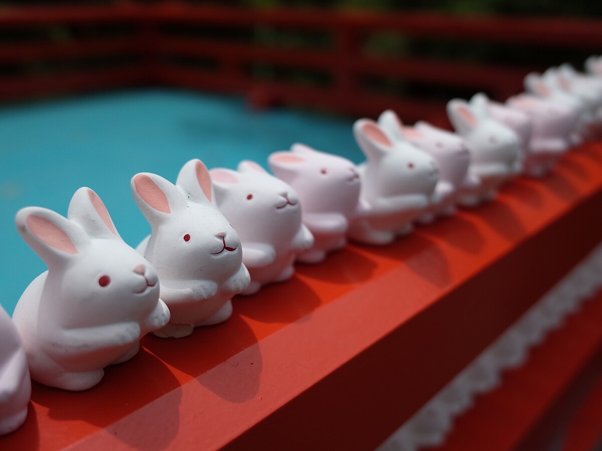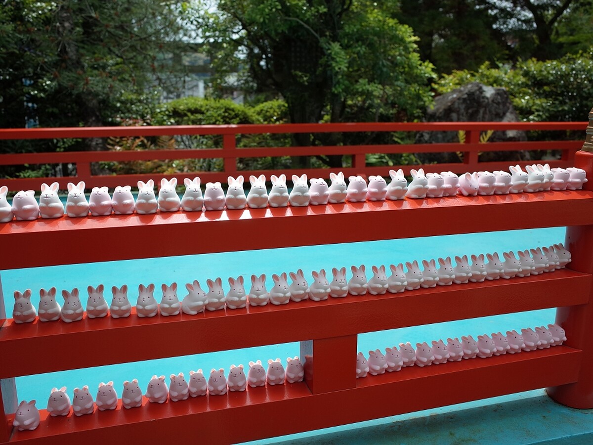 近年來岡崎神社一躍成為IG打卡熱點的原因是本殿對面擺滿整排的兔子擺飾!其實這是岡崎神社用來裝神籤的容器,許多參拜者抽籤後便把兔子容器奉納於此,白粉兩色加上每隻兔子的表情都不同超吸睛。