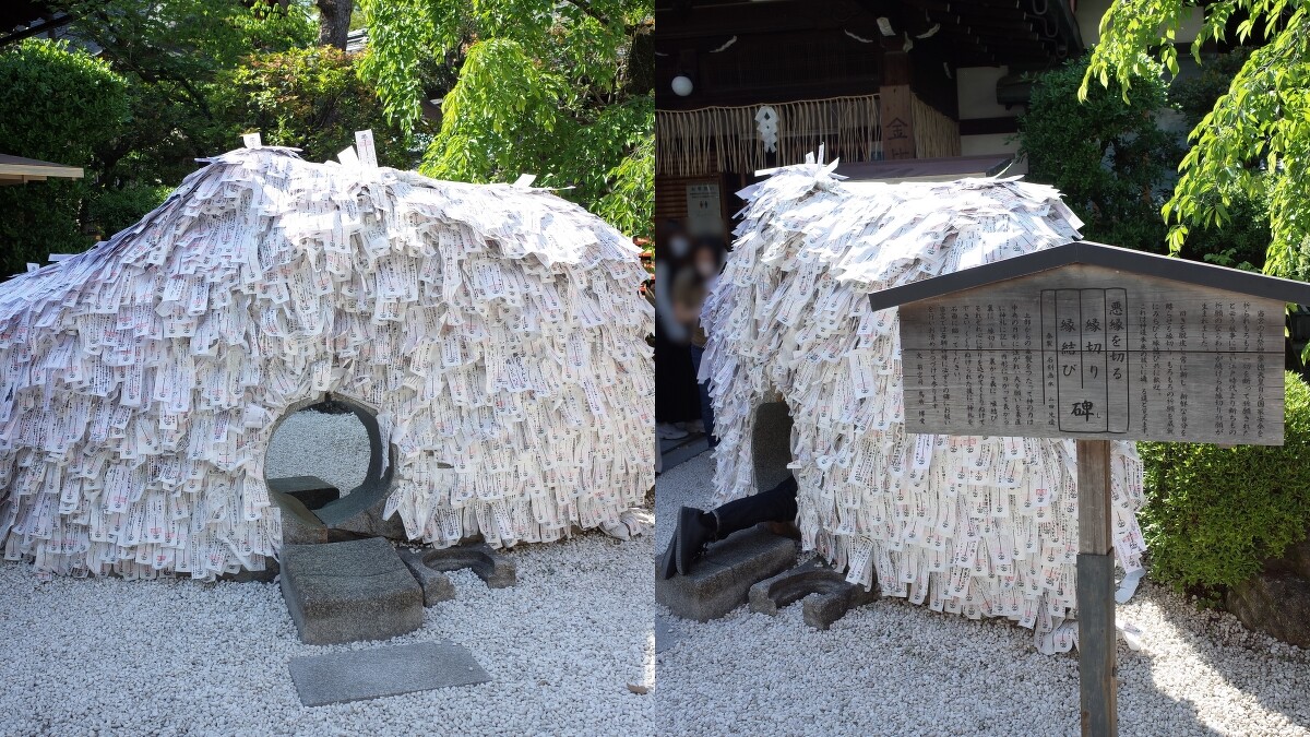 斷孽緣的方式就是在境內買一張祈願單,在祈願單上寫下願望後,拿著祈願單去鑽斷惡緣結良緣碑(縁切り縁結び碑)。鑽洞的時候要注意先從正面鑽到背面代表斷惡緣,之後一定要再從背面鑽回來正面才能結良緣喔~最後再把祈願單貼在碑上就大功告成!