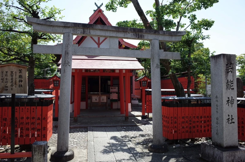 位於嵐山附近的「車折神社」,走進神社境內就能看到寫滿日本藝人名字的朱紅色木牌!原來境內設有一間小小的「藝能神社」,祭祀舞神天鈿女命(天宇受賣命)。在日本神話故事中天照大神和弟弟吵架後生氣地躲進天岩洞讓世界陷入一片黑暗,眾神商議著如何把天照大神騙出洞外,於是找來舞神天鈿女命跳舞助興開趴,當天照大神聽到眾神的笑聲好奇的走到洞口時趁機將她拉出洞外,終於讓世界恢復光明。