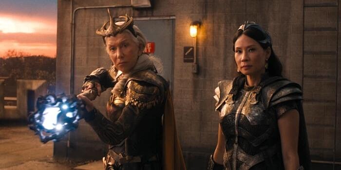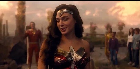 而在《沙贊!眾神之怒》的中段,他們也將相同的手法運用在神力女超人身上,甚至更利用這點安排了一個笑點。不過,正如本片在後來的預告中便已揭露的畫面一樣,到了片尾,由蓋兒.加朵(Gal Gadot)飾演的神力女超人則總算正式現身,並為故事帶來了最後的關鍵轉折。