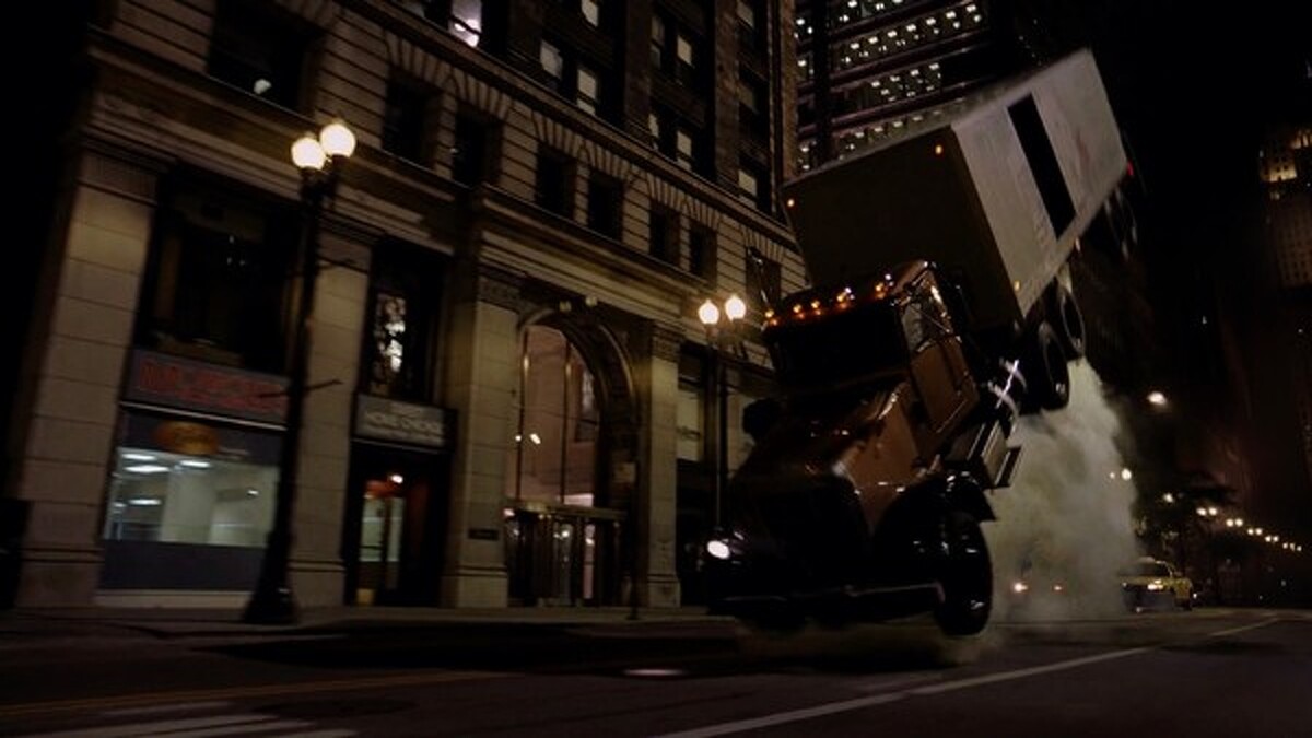 這個段落不僅使用真實卡車拍攝,就連拍攝場地也是在芝加哥市中心的真實街道上。劇組在卡車下方裝設一個內有炸彈的活塞,當炸彈爆炸時,活塞便會直接撞擊地面,讓卡車因此往前翻覆。而在諾蘭最愛的IMAX銀幕上,這個橋段則帶來了無與倫比的震撼感。