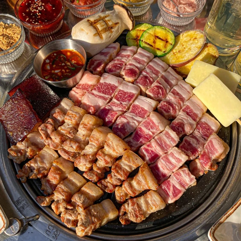 新鮮的烤肉除了可以和烤過的起司一起吃外,搭配著烤過的泡菜一起吃也是一絕。在烤盤上烤過的泡菜吸收了豬肉的肉汁及油脂,和三層肉一起吃不油不膩簡直絕配,最後一定要加點個豬肉泡菜鍋(통돼지찌개),讓充滿了所有烤肉精華的泡菜鍋為這一餐劃下完美的句點。