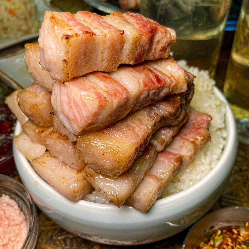 朗豬最大的特色就是使用石頭來替代一般的烤盤,在滾燙的石頭上烤熟的三層肉,多了一股煙燻的香味,多餘的肥油也會透過石頭的縫隙流掉一點也不殘留。