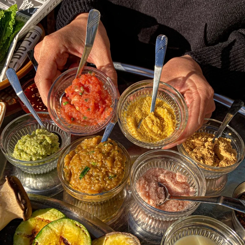 而看起來好好吃最特別的就是他們有很多不同的沾醬,不論是喜馬拉雅山玫瑰鹽、咖哩鹽、芥末醬還是店家特製的辣椒醬都各有特色,一種烤肉多重滋味,就等著喜歡嚐鮮的朋友來試試了。