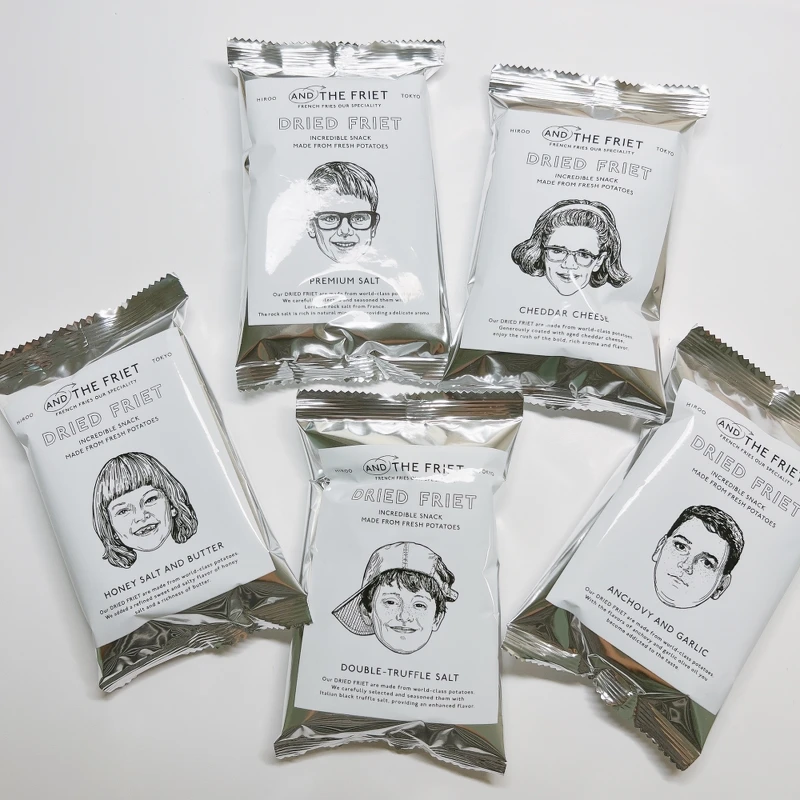 薯條餅乾一共有五種口味,分別是鹽味、黑松露鹽味、蜂蜜鹽&奶油、乳酪&香草、蒜味鯷魚,包裝以不同插畫來區分,非常獨特。我買的是一大盒中有五種不同口味的小包裝薯條餅乾,份量剛剛好,不管自己吃或送人都很棒。