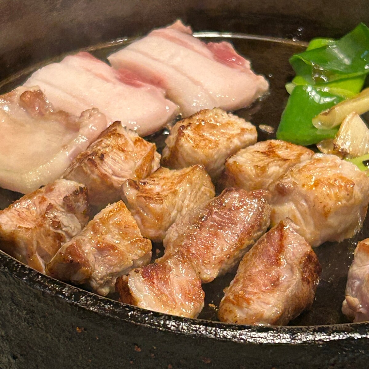 六星級最受歡迎的品項就是熟成三層肉(숙성스테이크삼겹살),厚度達三公分的三層肉,經過獨家熟成方法的處理,肉汁豐富、口感Q彈,令人回味無窮。不論是單吃、沾鹽吃都非常美味,尤其是搭配店家特製的大蔥泡菜一起吃更是一絕。