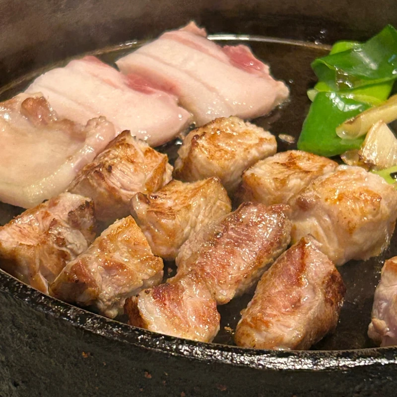 推薦大家來九老豚家可以點適合兩到三人吃的熟成脖三層套餐(숙성 목삼겹 세트),一次可以品嚐到九老豚家最出名的豬頸肉和三層肉。套餐還包含了像是茄子、洋蔥、甜椒等適合燒烤的蔬菜,烤好的豬肉和蔬菜一起放在烤盤上,看起來色香味俱全令人食指大動。