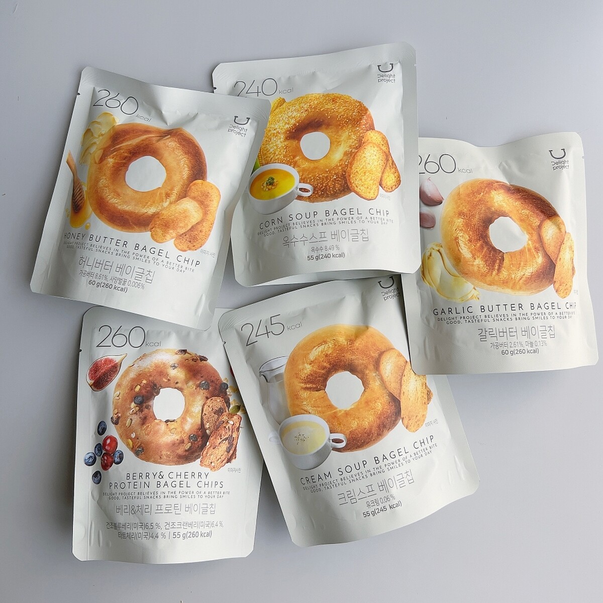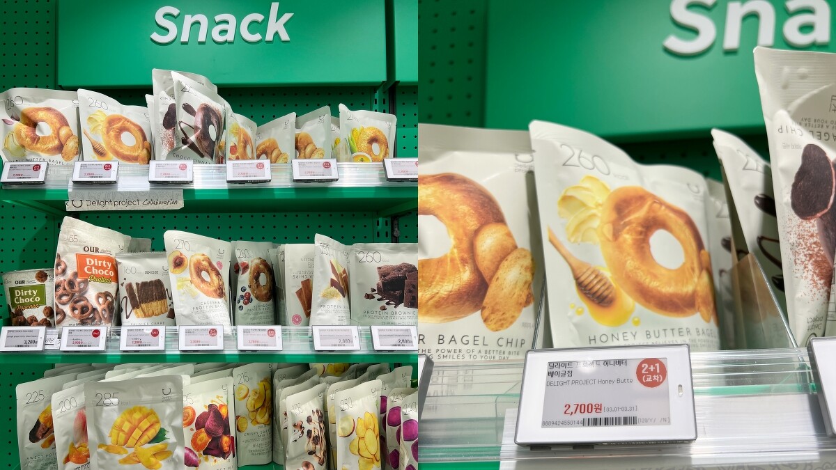 Olive Young的貝果餅乾也是鼎鼎大名,特色是口味眾多,而且熱量低,每一包左上方都有標示熱量,讓大家嘴饞之餘也吃得比較不會有罪惡感。