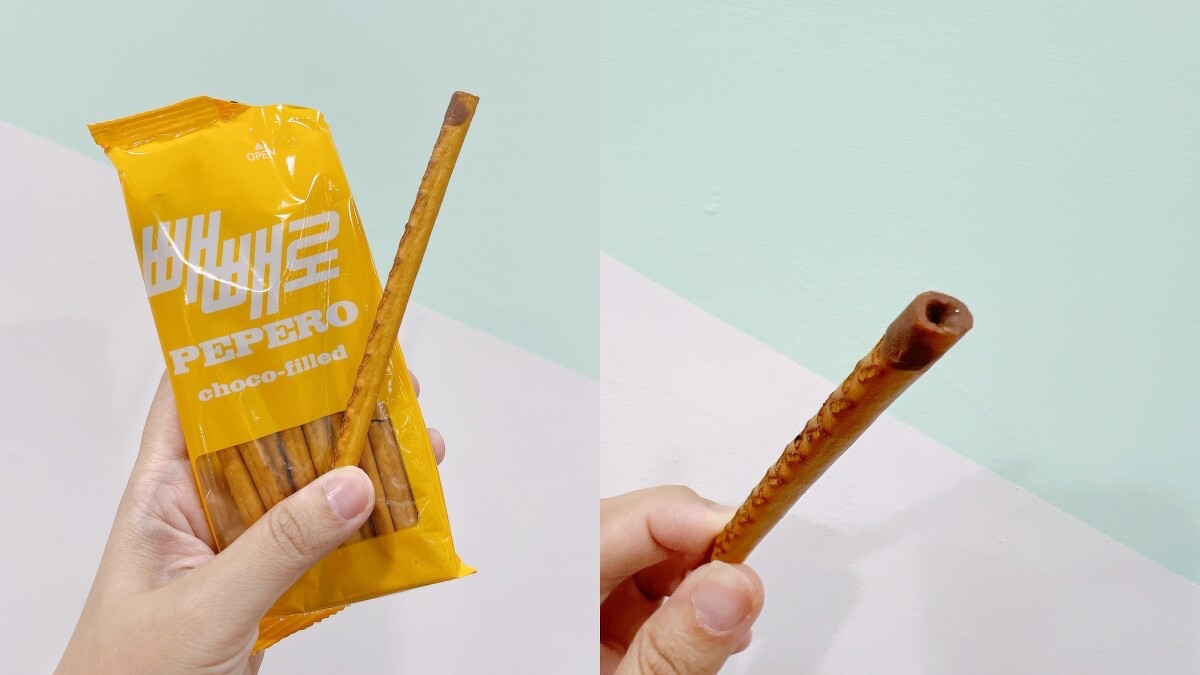 黃色口味的餅乾棒是中空的,當中灌滿巧克力,吃起來特別香甜濃郁。