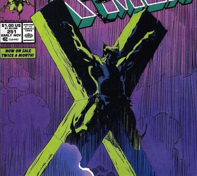 在其中一個平行宇宙裡,金鋼狼被釘在X字架上,周圍滿是人類頭骨。這個衝擊力十足的畫面,來自1989年7月《非凡X戰警》(Uncanny X-Men)第251期,而這一期的封面也被視為經典之作。