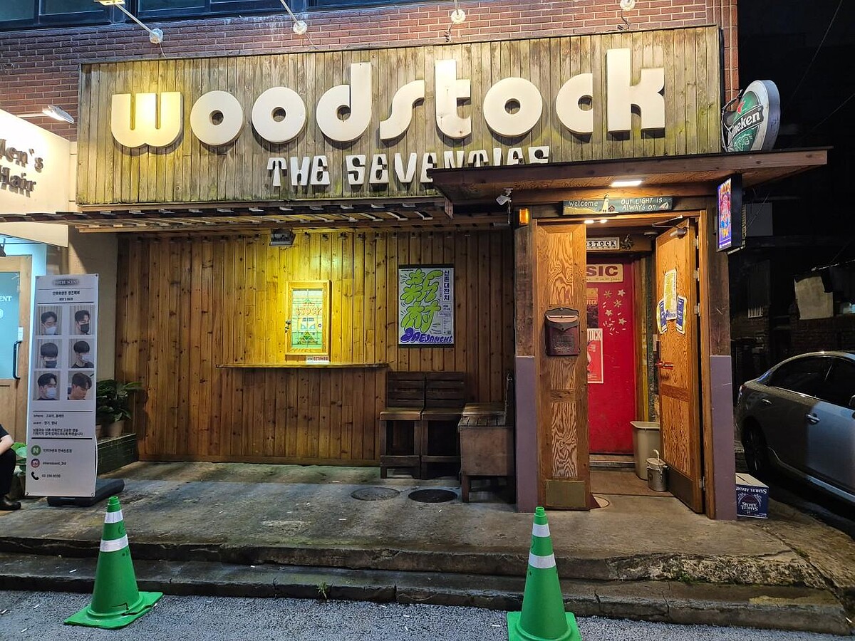 最後介紹的「woodstock」位在新村商圈的吃吧巷弄(먹자골목)內,於1992年開始營業,是一間超過30年的老酒吧,店裝非常符合店名,以木材為主的裝潢風格別有一番風味,甚至連菜單都是寫在木片上的非常特別。