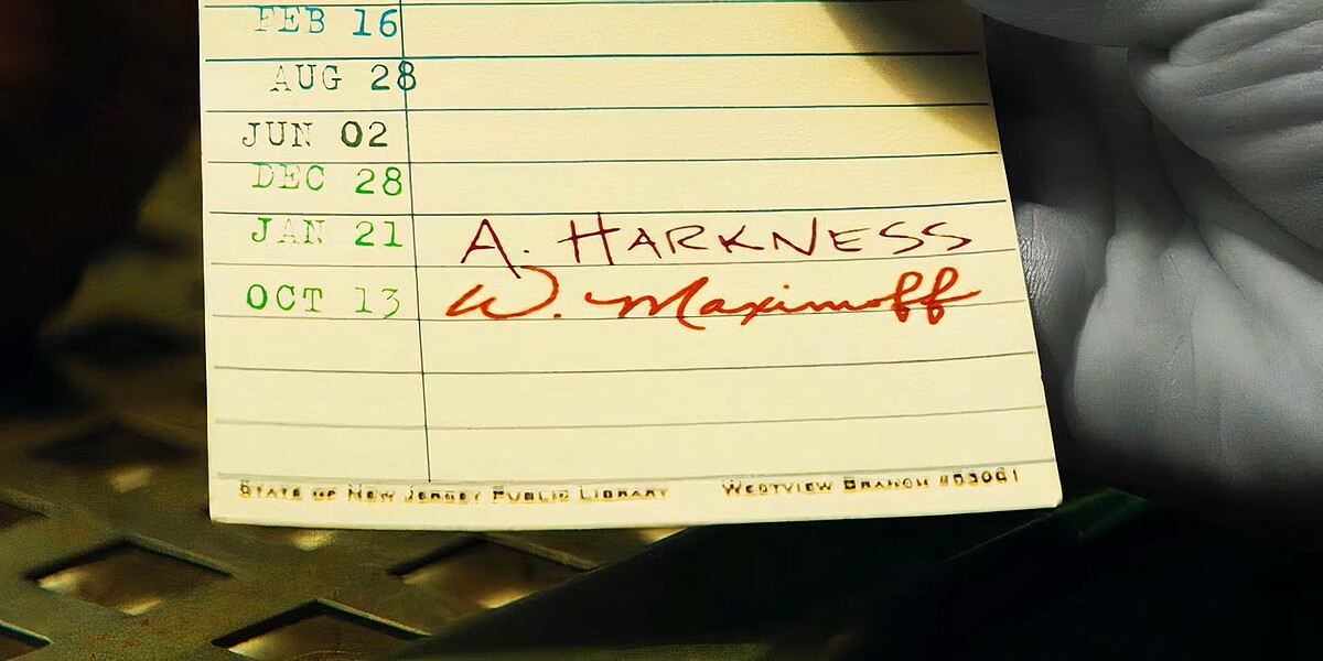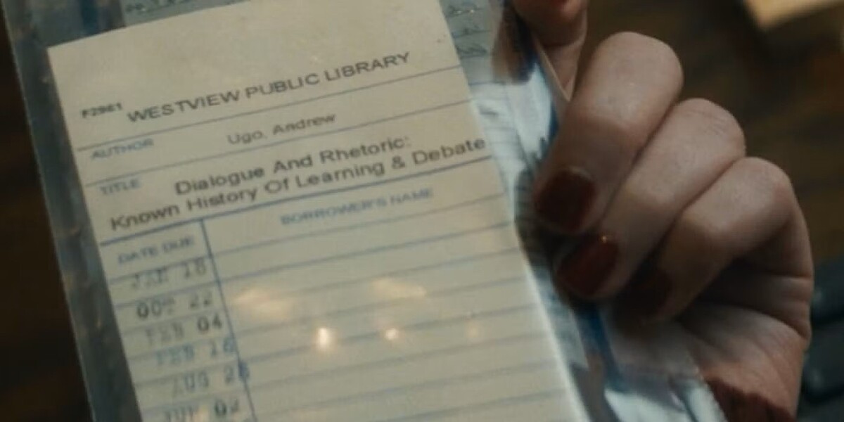 在無名屍身上發現的那張借書卡,書名是《對話和修辭:已知的學習和辯論歷史》(Dialogue And Rhetoric: Known History Of Learning & Debate)。要是把書名每個單字的第一個字母都挑出來,則可連成DARKHOLD,也就是《汪達幻視》裡的關鍵元素《黑暗神書》。至於作者安德魯.烏戈(Andrew Ugo)則是變位字,可以重組為萬達格這個地名。