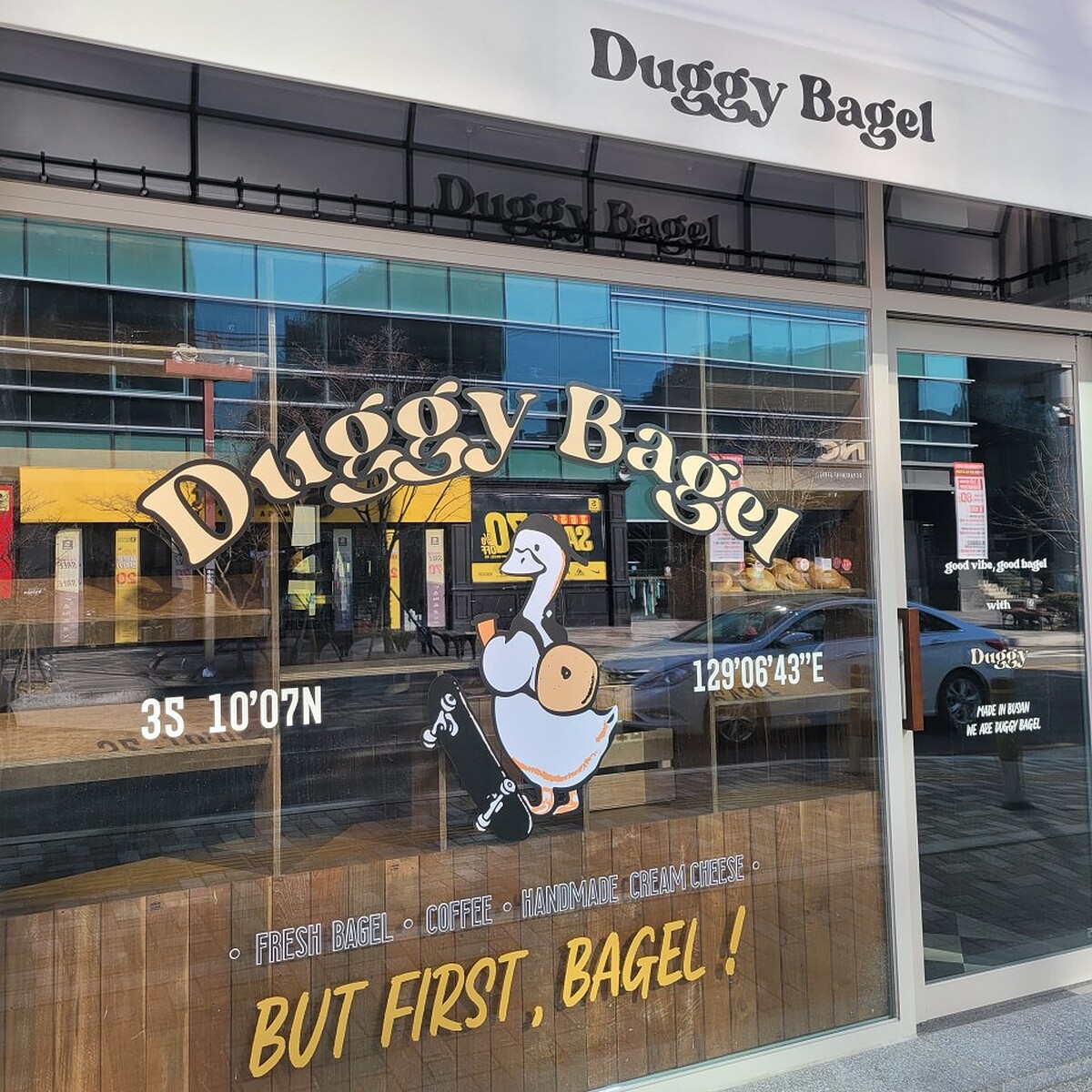 最後介紹的「Duggy Bagel」位在釜山大學正門旁邊,從釜山地鐵1號線釜山大站3號出口出發約5分鐘可以走到,是一間釜山在地出名的貝果專賣店。