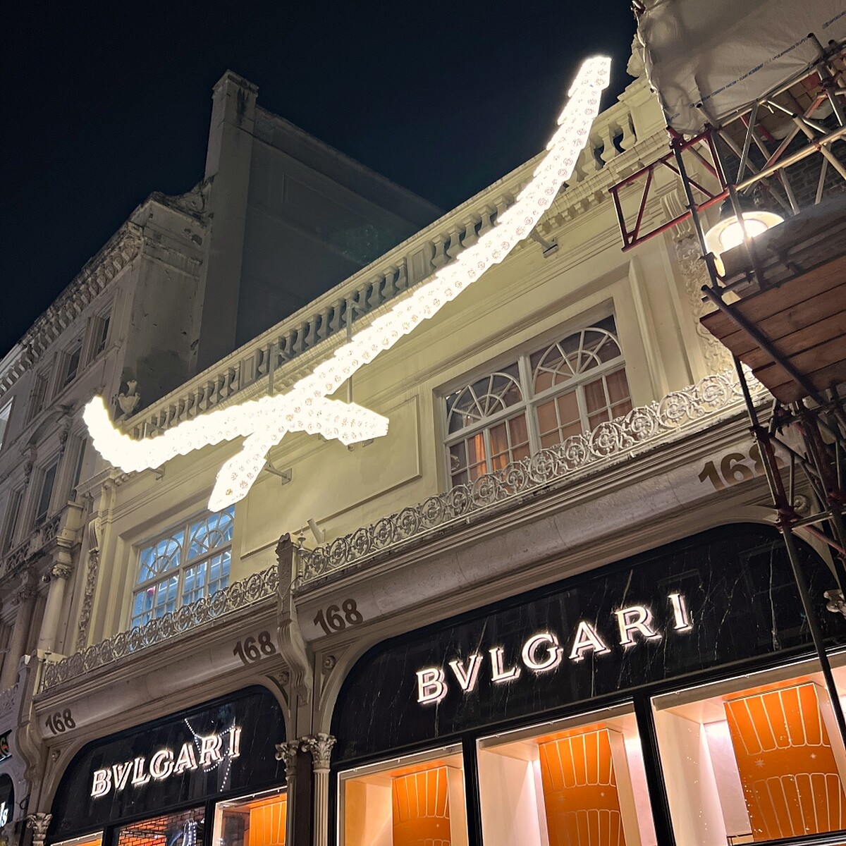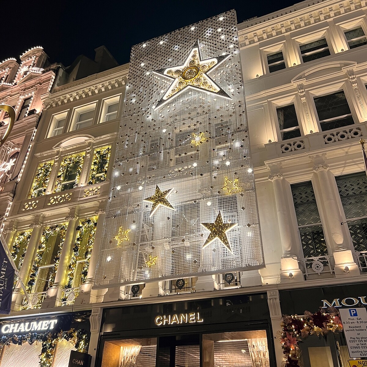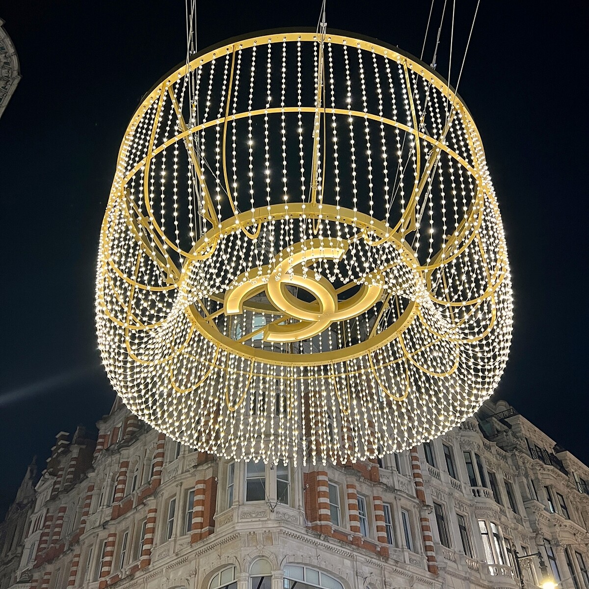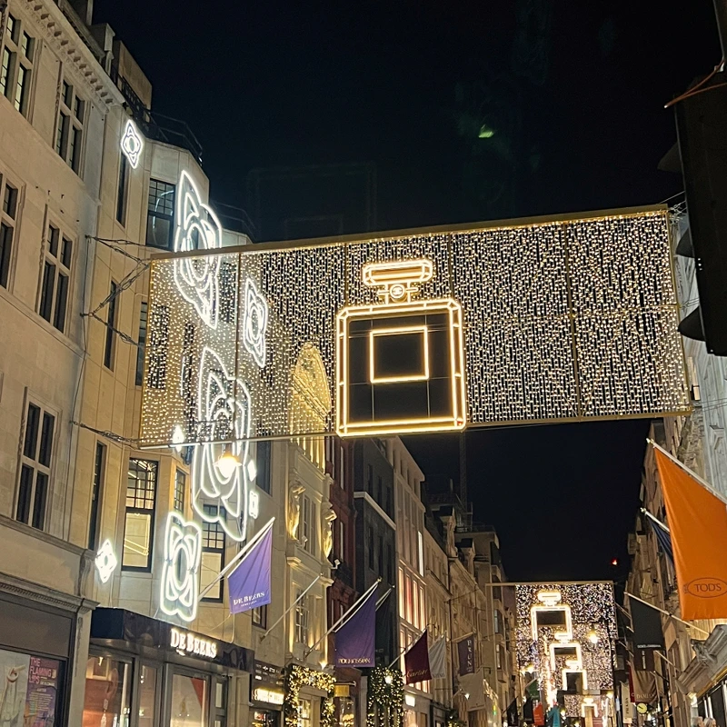 前兩年New Bond Street的路中央是巨大的皇冠燈飾,2024年則由香奈兒燈飾貫穿整條街,十字路口是經典的雙C Logo組成、而路中間則是N°5香水瓶身的燈飾,十分華麗。