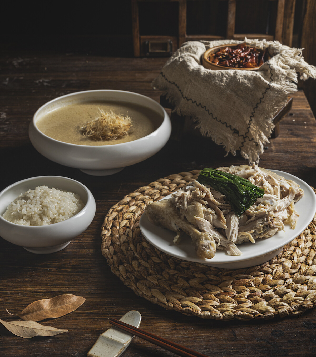 一般的人蔘雞湯是會將整支人蔘雞放在湯碗中上菜,然而北韓式的人蔘雞套餐,雞和湯是分開上菜,無垢屋的蔘雞湯是用大鐵鍋經過長時間熬煮出來的,可以想見整隻雞的精華都熬煮到了濃稠的雞湯內,有種喝上一口就立刻元氣加倍的感覺。