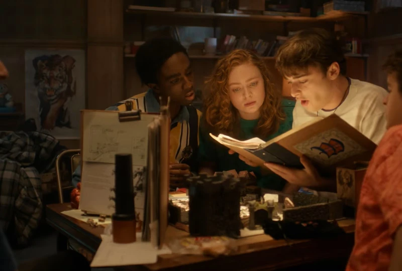 而芬恩.沃夫哈德(Finn Wolfhard)飾演的麥克、蓋頓.馬塔拉佐(Gaten Matarazzo)飾演的達斯汀、迦勒.麥羅林(Caleb McLaughlin)飾演的路卡斯、諾亞.施納普(Noah Schnapp)飾演的威爾,以及莎蒂.辛克(Sadie Sink)飾演的麥克絲這裡,則是以他們齊聚一堂的最後一場桌遊戲,成為了《怪奇物語》大結局最感人的段落。