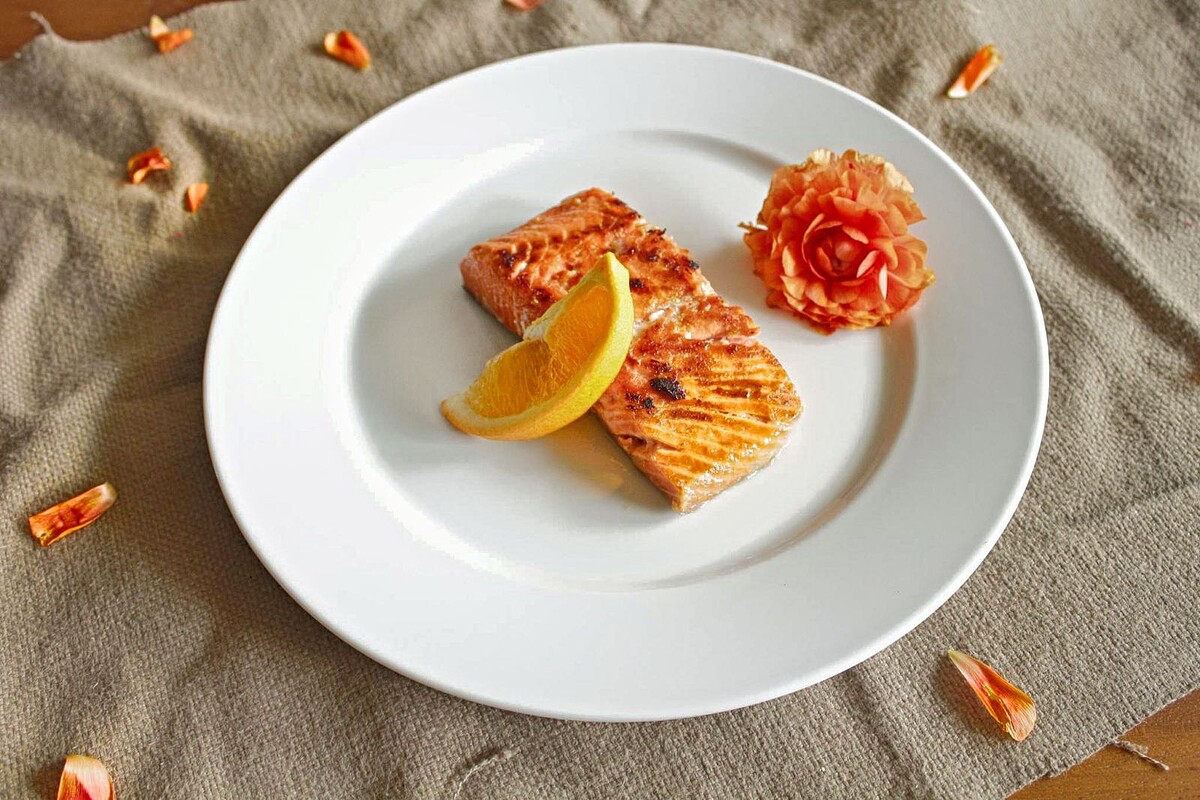 6.將鮭魚盛盤,淋上醬汁,並灑上適量的鹽與胡椒調味即可享用。