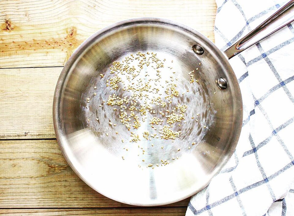 1. 平底鍋以小火預熱,倒入白芝麻炒香,炒至芝麻呈現棕黃色,大約3-5分鐘。記得炒的過程中要不時翻動芝麻以免燒焦。