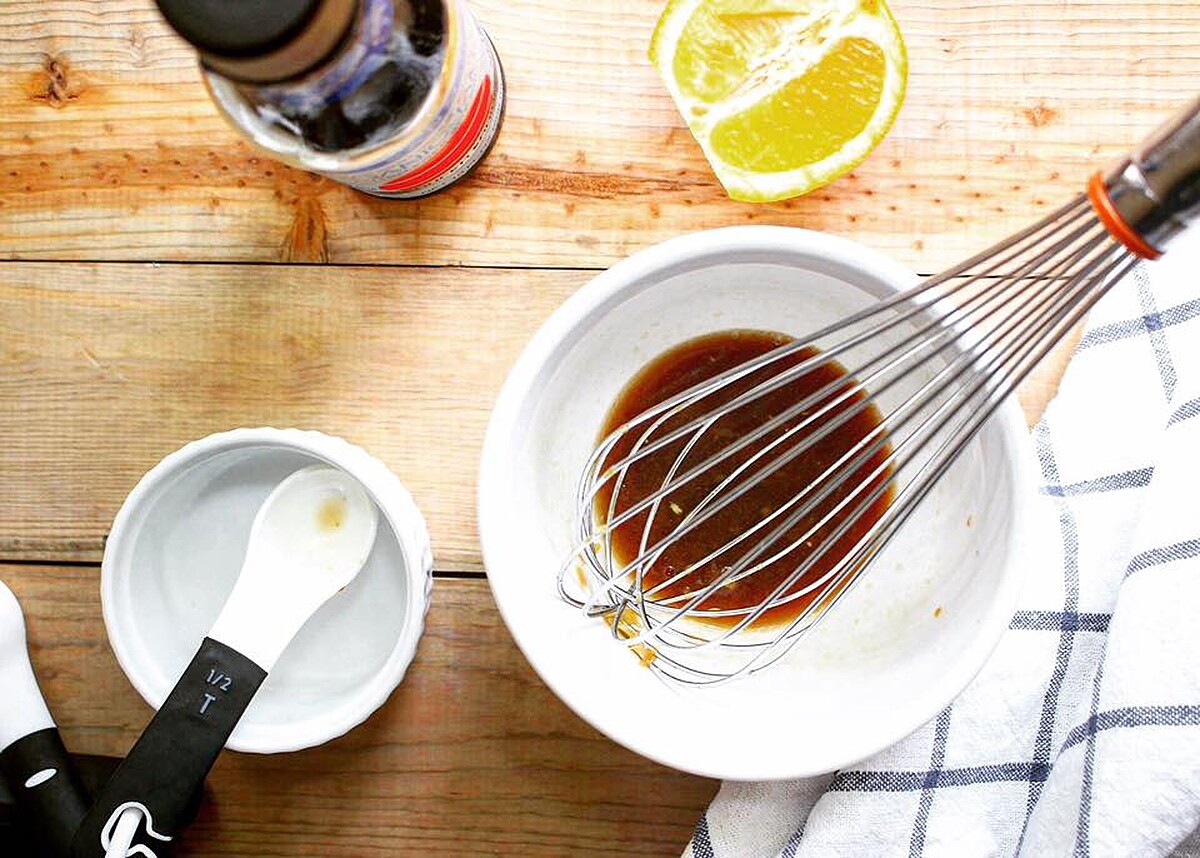 2. 將柳丁汁、低鹽醬油、白醋與麻油倒入攪拌盆,攪拌均勻成醬汁。