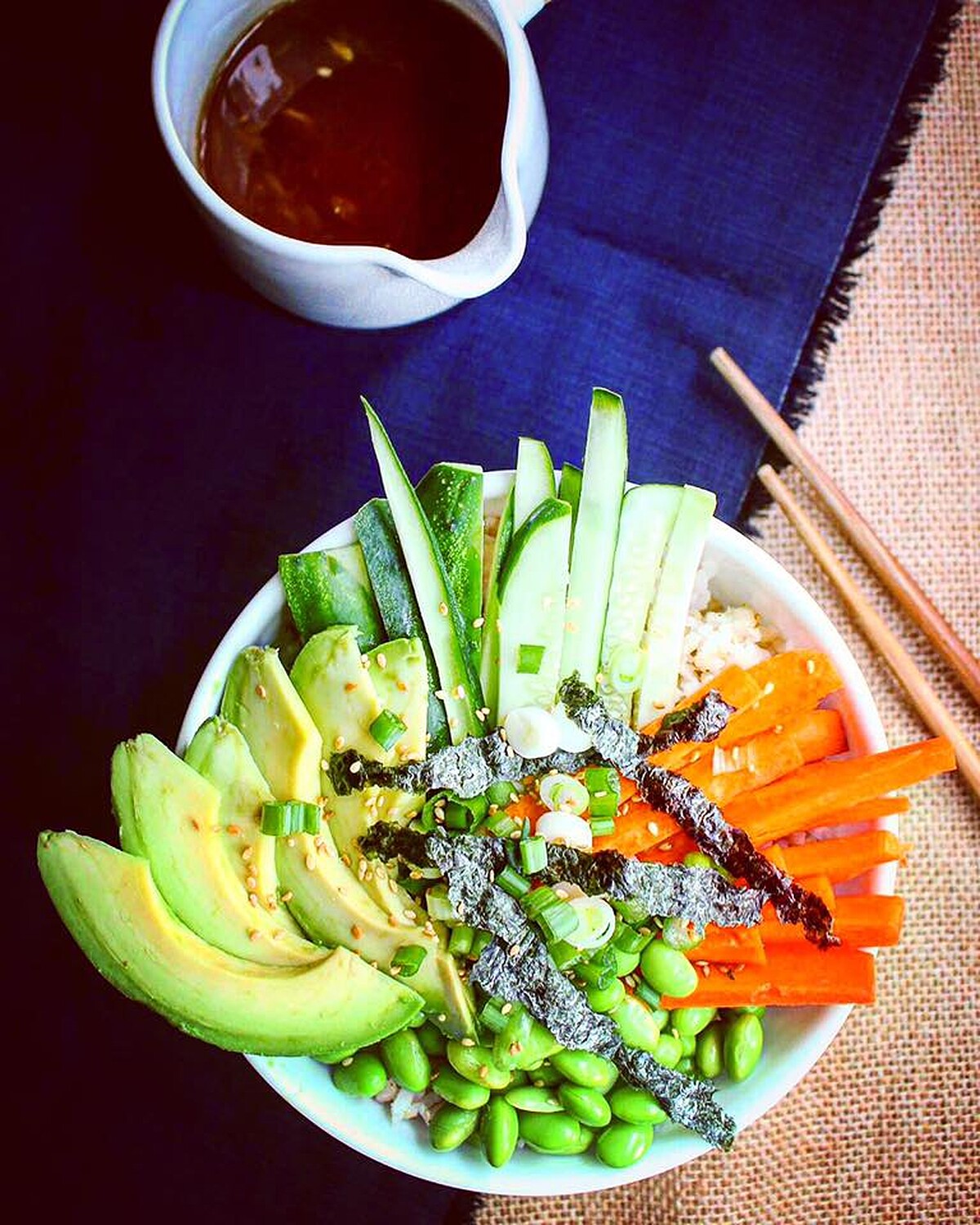 3. 取一碗裝入糙米飯,將毛豆、紅蘿蔔條、小黃瓜條與酪梨片平鋪於飯上;再淋上醬汁,撒上白芝麻、蔥花與海苔即可享用。