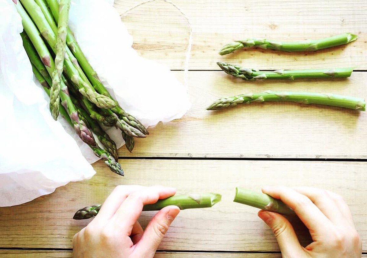 1.去除蘆筍纖維較多的尾部方法:一手拿著蘆筍的頂端,另一手拿著蘆筍的尾端,輕輕一折,蘆筍即會在鮮嫩與纖維粗的交界處斷裂。被折斷的尾部,即為蘆筍纖維較多、難咬的部分。將處理好的蘆筍切成約4-5公分的小段。