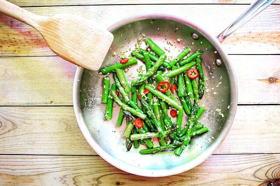 2. 平底鍋以中大火預熱,倒入橄欖油。加入蘆筍,以適量的鹽與胡椒調味,與熱油充分炒勻,至蘆筍顏色轉為鮮綠且八分熟,大約1-2分鐘。續入大蒜、薑與辣椒,快炒約30秒。